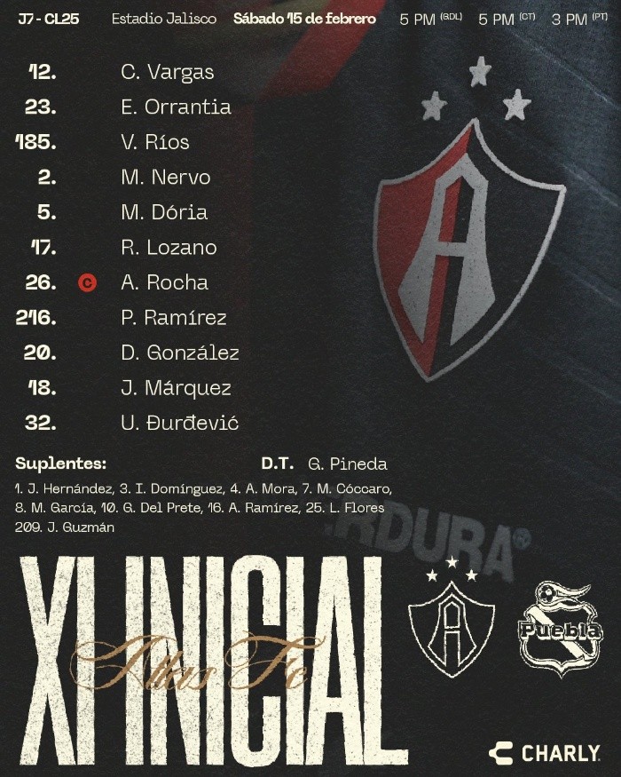 Deportes | Atlas vs Puebla • Momentos Destacados • Jornada 7 • Clausura 2025 Atlas y Puebla se enfrentan en la Jornada 7 en un duelo clave para ambos equipos sobre la cancha del Estadio Jalisco Sergio Alejandro Velázquez 15 de febrero de 2025 - 16:00 hs ATLAS3 ‒ 2PUEBLA Fin del partido Atlas derrota al Puebla 3-0 para conseguir su primera victoria del torneo Clausura 2025. 90+9' ¡Goooooooooooooooooooooooooooooooooool del Atlas! Uros Djurdjevic hace un golazo de último minuto con el que se define la ansiada victoria del Atlas. ¡Qué suene el organillo del Jalisco! Atlas lo gana con golazo. Atlas 3-2 Puebla EN VIVO: https://t.co/otSuJDiDJm I https://t.co/6fikf32Zig @VIX #SabadoFutbolero pic.twitter.com/FlpOYXeyyH — TUDN MEX (@TUDNMEX) February 16, 2025 90+3' ¡Atlas empata de último minuto! Diego González remata el balón desde el centro del área y el "Wacho" no logra frenar el disparo. Atlas empata así el partido en los últimos minutos del encuentro. ¡Empate a lo Atlas! Golazo de Diego González. Atlas 2-2 Puebla EN VIVO: https://t.co/otSuJDiDJm I https://t.co/6fikf32Zig @VIX #SabadoFutbolero pic.twitter.com/RFlrp2BbVP — TUDN MEX (@TUDNMEX) February 16, 2025 90+1' Modificaciones en Puebla Salen: Pablo González y Emilio Gómez. Entran: Cristian Mares y Tristhan Jaimes. 90' Agregan 8 minutos al segundo tiempo 85' Amarilla para el Puebla Fernando Arce recibe la segunda amonestación para el equipo visitante. 84' Atlas hace un cambio Sale Matheus Dória para dejar entrar a Gustavo del Prete. 76' Cóccaro cerca del segundo del Atlas Matías Cóccaro hace un disparo desde fuera del área que se queda cerca de convertirse en un golazo, sin embargo, el "Wacho" Jiménez aparece para realizar una gran atajada. ¡Paradón del 'Wacho' Jiménez! Portero evita el empate. Atlas 1-2 Puebla EN VIVO: https://t.co/otSuJDiDJm I https://t.co/6fikf32Zig @VIX #SabadoFutbolero pic.twitter.com/MlyZGiqbRh — TUDN MEX (@TUDNMEX) February 16, 2025 69' Amonestación para los rojinegros Diego González recibe otra amarilla para el Atlas, quienes ya suman tres amonestaciones a lo largo del encuentro. 68' Más cambios en Atlas Salen: Rivaldo Lozano y Carlos Orrantia. Entran: Jorge Guzmán y Matias Cóccaro. 67' Atlas insiste en el área del Puebla Atlas acumula minutos insistiendo en el ataque frente a la portería de Miguel Jiménez, pero no logran definir sus jugadas. A lo largo del segundo tiempo, Puebla mostró superioridad durante los primeros minutos, sin embargo, los rojinegros ya comienzan a desarrollar jugadas. 65' Cambios en Puebla Salen: Raúl Castillo y Juan Fedorco. Entran: Fernando Arce y Alberto Herrera. 53' Atlas realiza su primera modificación Sale Paulo Ramírez para dejar entrar a Leonardo Flores. 50' ¡Goooooooooooooooooooooooool de Puebla! Ricardo Marín le regresa la ventaja al puebla con un disparo cruzado que no logra frenar Camilo Vargas. ¡Zorros 'encamotados'! Gool del Puebla para recuperar ventaja. Atlas 1-2 Puebla EN VIVO: https://t.co/otSuJDiDJm I https://t.co/6fikf32Zig @VIX #SabadoFutbolero pic.twitter.com/M5TJaDEVIu — TUDN MEX (@TUDNMEX) February 16, 2025 Comienza el segundo tiempo Ambos equipos regresan al terreno de juego sin modificaciones. Fin del primer tiempo 45+2' Otra amarilla para los rojinegros Rivaldo Lozano recibe la segunda amonestación para el Atlas. 45' Agregan 7 minutos al primer tiempo 44' ¡Goooooooooooooooooooooooool del Atlas! Uros Djurdjevic es el encargado de cobrar el penal y consigue el empate para los rojinegros. ¡El Atlas lo empata desde los 11 pasos! Durdevic con el 1-1 Atlas 1-1 Puebla EN VIVO: https://t.co/otSuJDiDJm I https://t.co/6fikf32Zig @VIX #SabadoFutbolero pic.twitter.com/YXkxPv6Gok — TUDN MEX (@TUDNMEX) February 15, 2025 42' ¡Penal en favor de Atas! Djurdjevic es derribado dentro del área y el árbitro indica la pena máxima para el Puebla. 35' Amarilla para los Zorros Matheus Dória recibe la primera amonestación para el conjunto rojinegro. 33' ¡Puebla abre el marcador! Efrain Orona remata el balón con la cabeza tras un tiro de esquina para darle la ventaja al conjunto visitante. ¡Gool del Puebla! Efraín Orona, de cabeza Atlas 0-1 Puebla EN VIVO: https://t.co/otSuJDiDJm I https://t.co/6fikf32Zig @VIX #SabadoFutbolero pic.twitter.com/4AgF4mb7sc — TUDN MEX (@TUDNMEX) February 15, 2025 29' Atlas cerca del gol con tiro a larga distancia Miguel Jiménez frena un tiro a larga distancia desde media cancha. El encuentro se desarrolla con cambios de posesión constante y ambos bandos insisten por generar peligro en los dos extremos de la cancha. 16' Puebla comienza a atacar Los jugadores de la Franja comienza a obtener posesiones más largas y ya se posicionan dentro del área rival para atacar el arco de Camilo Vargas. Las acciones ofensivas comienzan a mostrarse balanceadas y la disputa del balón se mantiene de manera constante. 10' Primera amarilla del encuentro para Puebla José Pachuca recibe la primera amonestación para el conjunto visitante. 5' Atlas arranca con la posesión El conjunto rojinegro comienza el encuentro capitalizando la posesión del balón y ejerciendo presión cerca del área rival. Hasta el momento no ha llegado una jugada de peligro, pero los Zorros continúan buscando entradas en la defensa del Puebla. Arranca el partido El árbitro da el silbatazo y se empieza a disputar el partido correspondiente a la Jornada 7 en la cancha del Jalisco. Alineación de Atlas Alineación de Puebla Transmisión del encuentro Atlas y Puebla se enfrentan este 15 de febrero en la Jornada 7 del Clausura 2025, en un duelo clave para ambos equipos en el Estadio Jalisco. Los rojinegros, dirigidos por Gonzalo Pineda, buscan su primera victoria del torneo tras una dolorosa derrota ante Tigres, que los dejó en el puesto 15 con solo cuatro puntos. Por su parte, la Franja de Benjamín Mora tampoco atraviesa su mejor momento, con tres derrotas en su historial, la más reciente frente al América, aunque se ubican en el 