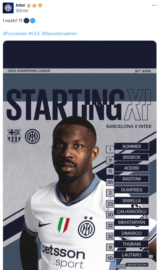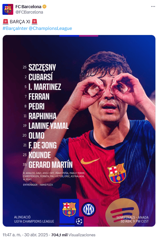 Deportes | Barcelona vs Inter de Milán EN VIVO: jugadas destacadas de la semifinal de Champions League Entérate de los momentos más relevantes del partido de ida de las semifinales Oralia López 30 de abril de 2025 - 14:54 hs 3 ‒ 3 Termina el partido El encuentro termina con un vibrante empate a 3 goles. Todo se definirá en la vuelta. ¡Autogol! Un tiro de Raphina pegó en el travesaño, luego en la espalda del arquero Yan Sommer, y el balón terminó dentro de su propia meta. Se empareja el marcador otra vez. ¡Gooool! Dumfries anota al minuto 65 y el Inter retoma la ventaja. Inicia el segundo tiempo Los equipos regresan al terreno de juego tras el descanso y comienza la segunda parte. Medio tiempo en Montjuic Los jugadores se van al descanso con el partido empatado a 2 goles. ¡Goool! Ferran Torres anota al 38 y se empareja el marcado. ¡Uno más! Ahora blaugrana Lamine Yamal se hace presente y Barcelona da señales de vida con el gol al minuto 24. Se juega un partido digno de Champions League. ¡Gooool! Denzel Dumfries amplía el marcador al minuto 21, tras una asistencia de Acerbi. ¡Goool! Apenas comenzaban las acciones, cuando en una gran jugada, Marcus Thuram mandó el balón al fondo de la red, y al minuto 1 Inter ya tiene la ventaja. ¡Arranca el partido! El silbante decreta el inicio del encuentro en el Estadio Olímpico de Montjuic. Listas, las alineaciones para el partido Los equipos dan a conocer el "11" con el que saldrán al terreno de juego. Temas Barcelona Inter de Milán Futbol Internacional Champions League en vivo Lee También Chivas Femenil, ante una misión casi imposible contra América Amnistía Internacional preocupada por la disolución de partidos políticos en Malí "Loco" Abreu, nuevo técnico de Xolos ¿Dónde ver EN VIVO el partido de semifinales Chivas vs América femenil?