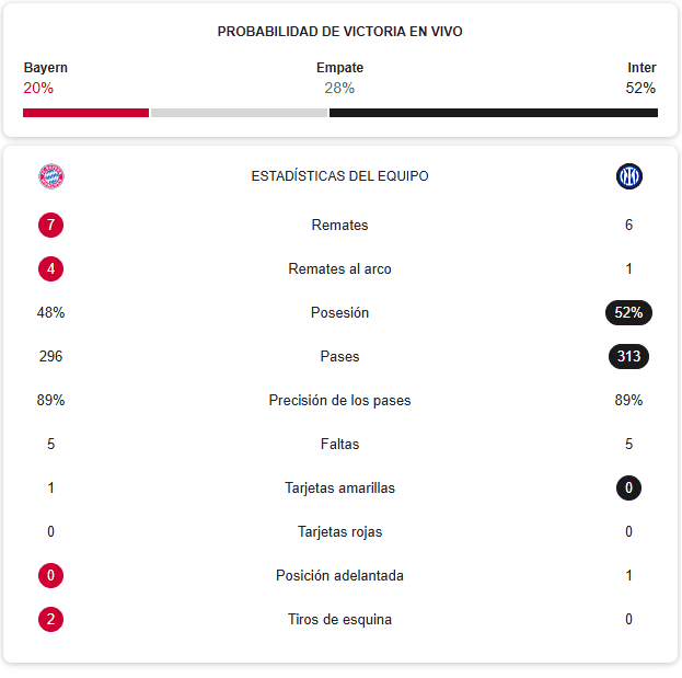 Deportes | Bayern Munich vs Inter de Milán EN VIVO: minuto a minuto de los cuartos de final de Champions League Sigue las acciones del partido de este partido de ida de los cuartos de final de la Champions League El Informador 8 de abril de 2025 - 12:00 hs 1 ‒ 2 Termina el partido Inter saca la victoria de visitante por dos goles a uno. Tarjeta para el Inter Zalewski es amonestado tras una dura falta y el Bayern tendrá la última en búsqueda del empate. Último cambio para el Inter - '90 Se retira Lautaro Martínez e ingresa Zalewski. Inzaghi buscará sellar la ventaja para llevársela a San Siro. ¡Gol del Inter! - '87 Cuando parecía que el equipo local lograría la remontada, un contragolpe perfecto dejó a Fratessi sin marca en el área chica, quien remató a comodidad para anotar. ¡Gol del Bayern! - '85 La presión era asfixiante. Müller remata en el área chica y empata la serie. Nuevos cambios para el Inter - '78 Bisseck remplazará a Darmián. Primeros cambios - '74 En el Inter: entra Fratessi y sale el recién amonestado Mjitaryán. Para el Bayern entran Gnabry, Müller, Boey; y salen Sané, Guerreiro, Minjae. Otra amarilla para el Inter Henrij Mjitaryán se barre por detrás y deja en buena oporunidad a los atacantes del Bayern. Presiona Bayern Múnich Raphael Guerreiro aprovecha una serie de rebotes en el área grande del Inter para disparar de volea, pero el remate se escapa por encima del marco. ¡Amarilla para el Inter! El capitán Lautaro Martínez impide un contragolpe del Bayern por lo que es amonestado. Comienza la segunda parte Bayern e Inter disputan los 45 minutos restantes de este partido de ida de los cuartos de final de la Champions League. Estadísticas del primer tiempo Así recopila Google los números de la primera mitad entre el Bayern y el Inter de Milán: Termina el primer tiempo Inter vence al Bayern de visita por la mínima tras disputarse los primeros 45 minutos de la eliminatoria. ¡Golazo del Inter! - '37 Una triangulación espectacular termina en un disparo de Lautaro Martínez de tres dedos para adelantar al equipo italiano. El VAR deberá revisar un posible fuera de lugar. ¡Primera importante del Inter! Contragolpe que terminó en la zurda de Carlos Augusto. El disparo se marcha desviado y pega en el costado de la red. Amonestación para el Bayern - '27 Kim se lleva la tarjeta amarilla por una dura "plancha" sobre un atacante del Inter. Es la primera tarjeta del partido. ¡Kane al poste! Un contragolpe fulgurante del Bayern dejó al nueve del equipo alemán casi de frente al arco de Sommer, sin embargo, el disparo se estrelló en el poste. El equipo local no ha logrado poner en el marcador su superioridad en el campo. Yan Sommer es factor - '22 El arquero del Inter se comienza a perfilar como la figura del encuentro con un par de atajadas claves para mantener el cero. Nuevamente el Bayern cerca - '13 El equipo local se encuentra mejor en la cancha. Harry Kane remata un centro en los linderos del área chica, sin embargo, no logró dar ni dirección ni fuerza para poder abrir el marcador. ¡Bayern tiene la primera! - '6 Inicio intenso e impreciso en el que el Bayern se acerca al arco con un disparo de Michael Olisse que se va desviado a tiro de esquina. ¡Comienza el partido! Bayern e Inter ya disputan los primeros minutos del partido de ida de los Cuartos de Final de la Champions League. Arbitraje El central para el partido entre Bayern e Inter será el suizo Sandro Schärer. Este es su equipo completo: Árbitro asistente 1: Stéphane De Almeida Árbitro asistente 2: Jonas Erni Cuarto árbitro: Lukas Fähndrich VAR: Fedayi San Asistente VAR: Pol van Boekel Alineación del Inter Inzaghi buscará llevarse la ventaja con estos jugadores: Pronti a dare tutto ����#ForzaInter #UCL #BayernMonacoInter pic.twitter.com/vnr6lVzVKd — Inter ⭐⭐ (@Inter) April 8, 2025 Alineación del Bayern Este es el once que manda Kompany para disputar el partido: ��♦️������������ ���������������� ���������� ���������� ♦️��#packmas #FCBINTER #UCL pic.twitter.com/kRrlMYgpbA — FC Bayern München (@FCBayern) April 8, 2025 Bayern de Múnich e Inter de Milán disputan los primeros 90 minutos de ida de los cuartos de final de la Champions League. El partido comienza a las 13:00 horas. Temas Champions League Futbol Internacional Bayern Munich Inter de Milán Lee También Arsenal vs Real Madrid EN VIVO: minuto a minuto de los cuartos de final de Champions League Chivas busca cierre perfecto de otros torneos, por un boleto al Play-In ESTA es la actualidad de Hugo Camberos con Chivas Johan Vásquez destaca entre defensas zurdos de la Serie A