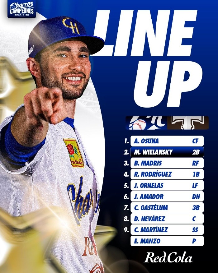 Deportes | Charros vs Tucson • Juego 1 • Momentos destacados • LMP Charros de Jalisco enfrentan a Tucson Baseball Team en el primer juego de la serie El Informador 19 de diciembre de 2025 - 23:13 hs CHARROS17 ‒ 10TUCSON NOVENA BAJA Francisco Pérez conecta roletazo y es dominado en primera. Gaige Howard recibe base por bolas. Marco Chicuate abanica y se poncha. Missael Rivera saca rodado y es ponchado en primera. Charros comienza con victoria la serie ante Tucson. Pizarra: Jalisco 17 - 10 Tucson. NOVENA ALTA Julián Ornelas batea un elevado que es dominado por Edgar Lugo. Japhet Amador conecta sólido batazo que es controlado por Lugo para el segundo out. Christopher Gastelum conecta sencillo. Gael Guzmán saca roletazo y Tucson consigue doble matanza con ponches en primera y segunda. OCTAVA BAJA Charros hace cambio de pitcher: Gael Bojórquez reemplaza a Bryan Lozano. Alejandro Quezada conecta sencillo por jardín derecho. Luis Amador recibe base por bolas. Samar Leyva recibe base por golpe. Gaige Howard saca out forzado y Leyva queda ponchado en segunda, pero Quezada logra anotar. Marco Chicuate consigue sencillo que manda a Amador a anotar. Missael Rivera batea un doble que produce una rayita. Marcos Valenzuela se embasa por error en el fildeo de Luis Martínez y Tucson logra anotar dos carreras. River Town saca elevado que es dominado por José Aguilar. Edgar Lugo recibe base por bolas. Charros hace cambio de pitcher: Jonathan López sustituye a Gael Bojórquez. Alejandro Quezada conectar triple que manda a Valenzuela y Lugo a anotar. Luis Amador abanica y se poncha. Pizarra: Jalisco 17 - 10 Tucson OCTAVA ALTA Tucson hace cambio de pitcher: Dalton Rodríguez reemplaza a Erick Preciado. Michael Wielansky conecta elevado de out. Bligh Madris saca elevadito que es dominado por River Town. Francisco Córdoba eleva la bola que es capturada por Jesús Fabela. SÉPTIMA BAJA Charros hace cambio de pitcher: Bryan Lozano reemplaza a Adrián Gusman. Marco Chicuate saca elevado de out que es dominado por Luis Martínez. Missael Rivera conecta doble. Marcos Valenzuela es retirado. River Town conecta hit productor para llevar a Rivera al plato. Edgar Lugo conecta rola y es retirado en primera. Pizarra: Jalisco 17 - 3 Tucson SÉPTIMA ALTA Julián Ornelas batea sencillo por jardín derecho. Japhet Amador conecta su segundo cuadrangular de la noche y se lleva por delante a Ornelas. Christopher Gastelum abanica y se poncha. Gael Guzmán saca roletazo y queda ponchado en primera. Luis Martínez conecta sencillo. Tirso Ornelas conecta elevado de out. SEXTA BAJA Charros hace cambio de pitcher: Adrián Gusman sustituye a Alemao Hernández. Luis Amador conecta roletazo y es dominado en primera. Samar Leyva abanica y se poncha. Gaige Howard saca roletazo para quedar dominado en primera. Pizarra: Charros 15 - 2 Tucson SEXTA ALTA Tucson hace cambio de pitcher: Eduardo Mares reemplaza a Denny Román. Julián Ornelas se poncha sin tirarle. Japhet Amador conecta cuadrangular. Christopher Gastelum batea elevado de out que es dominado por Jesús Fabela. Dean Nevárez recibe base por bolas. Gael Guzmán reemplaza a Nevárez en primera. Luis Martínez conecta sencillo por jardín izquierdo, Guzmán avanza a segunda. José Aguilar sale como bateador emergente y se embasa con pasaporte, Charros tiene casa llena. Michael Wielansky se embasa con error en el fildeo de Missael Rivera y Gael logra anotar. Tucson hace cambio de pitcher: Erick Preciado reemplaza a Eduardo Mares. Con wild pitch, Martínez llega a tierra prometida. Bligh Madris batea doble productor que suma dos carreras más. Francisco Córdoba se poncha con swing. QUINTA BAJA River Town eleva la bola y es atrapada por Alex Osuna. Antonio Hernández saca rodado para ser dominado en primera. Jesús Fabela conecta elevado de out que es interceptado por Julián Ornelas. Pizarra: Charros 10 - 2 Tucson QUINTA ALTA Tucson hace cambio de pitcher: Denny Román reemplaza a Jorge Sauceda. Dean Nevárez consigue sencillo. Luis Martínez recibe base por bolas, Nevárez avanza a segunda. Alejandro Osuna saca elevado de out que es dominado por River Town. Michael Wielansky conecta sencillo, Nevárez va para tercera y Martínez a segunda. Bligh Madris saca out de sacrificio para mandar a Nevárez al plato, tras error de lanzamiento, Martínez también logra llegar a home. Reynaldo Rodríguez conecta roletazo y es dominado en primera. CUARTA BAJA Samar Leyva batea doble por jardín central. Gaige Howard saca elevado de out que es atrapado por Alejandro Osuna. Marco Chicuate conecta elevado de out que es dominado por Dean Nevárez en zona de faul. Antonio Hernández consigue doblete productor que lleva a Leyva a tierra prometida. Marcos Valenzuela saca roletazo y es dominado en primera. Pizarra: Charros 8 - 2 Tucson CUARTA ALTA Bligh Madris saca roletazo lento y es dominado en primera. Reynaldo Rodríguez conecta elevado de out que es atrapado por Edgar Lugo. Julián Ornelas batea triple por jardín central. Japhet Amador recibe base por bola. Christopher Gastelum conecta roletazo para out forzado y Amador queda ponchado en segunda. TERCERA BAJA Charros hace cambio de pitcher: Alemao Hernández sustituye a Edgar Manzo. Ramón Mendoza conecta sencillo por jardín derecho. River Town saca sencillo, Mendoza avanza a segunda. Edgar Lugo conecta otro sencillo para que Mendoza anote y Town llegue a segunda. Jesús Fabela saca roletazo y Charros consigue doble matanza. Agustín Ruiz batea roletazo y es dominado en primera. Pizarra: Charros 8 - 1 Tucson TERCERA ALTA Dean Nevárez se embasa con pasaporte. Luis Martínez batea un elevado de out que es atrapado por Edgar Lugo. Alejandro Osuna conecta elevadito que es dominado por Missael Rivera. Michael Wielansky eleva la bola y Edgar Lugo la intercepta para el tercer out. SEGUNDA BAJA Gaige Howard recibe base por bolas. Marco Chicuate conecta rola y Charros consigue doble mantanza con out en primera y segunda base. Missael Rive