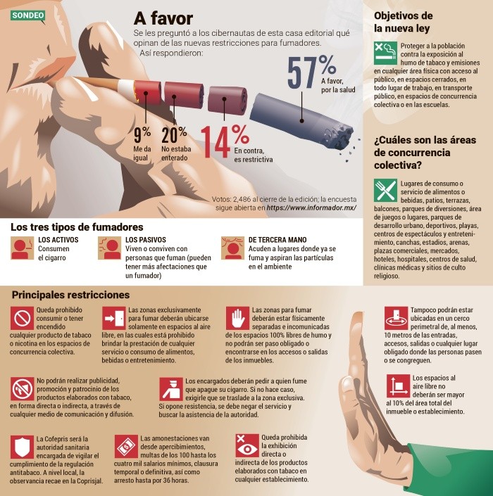 Desde este domingo están vigentes los cambios en la Ley General para el Control del Tabaco, que principalmente incluyen nuevas restricciones para fumadores y reglas para centros de entretenimiento o consumo de alimentos, así como cambios en los permisos en materia publicitaria.Para los consumidores, queda prohibido fumar en lugares de consumo o servicio de alimentos o bebidas, patios, terrazas, balcones, parques de diversión, áreas de juegos o lugares, parques de desarrollo urbano, deportivos, playas, centros de espectáculos y entretenimiento, canchas, estadios, arenas, plazas comerciales, mercados, hoteles, hospitales, centros de salud, clínicas médicas y sitios de culto religioso, entre otros. Y para los dueños de negocios, sí pueden tener áreas destinadas para fumar, pero el cambio es que no permitirán el ofrecimiento de alimentos o bebidas. Hay sanciones de hasta 829 mil pesos.Fabiola Macías Espinoza, profesora de la Universidad de Guadalajara, explica que la reforma también tiene el objetivo de disminuir la publicidad en cigarros para prevenir que las personas fumen desde edades tempranas. Y regula los espacios donde se fuma: “Aunque hay áreas de fumar y no fumar, las partículas quedan en el aire y provocan daños, especialmente a personas vulnerables”.Tras un sondeo realizado a más de 15 establecimientos ubicados en la zona de Chapultepec, ningún encargado conocía la nueva norma. “No sabía… y la mayoría de los clientes son fumadores. Buscaremos encontrar una solución, ya que en la terraza sí se puede fumar”, dijo Marcos Saucedo, gerente de un bar.Mario Ávalos, presidente de la Cámara Nacional de la Industria de Restaurantes y Alimentos Condimentados en Jalisco, acentuó que han realizado reuniones para explicar el tema.Tras un sondeo realizado con dos mil 486 cibernautas de esta casa editorial, la mayoría estuvo a favor de las reformas que aumentan las restricciones para los fumadores, con la intención de no afectar la salud de las personas. Al corte de la presente edición, el 57% se mostró de acuerdo con las reformas a la Ley General para el Control del Tabaco. “Yo nunca he fumado, por eso me parece bien que sean más restrictivos en todos los lugares. Que se respete a los que no fumamos”, subrayó Juan Tejeda, mientras consumía alimentos en un restaurante de Providencia. En el sondeo mencionado, el 14% se mostró en contra, el 20% ni siquiera estaba enterado de la nueva legislación y al 9% le daba lo mismo. Mario Ávalos, presidente de la Cámara Nacional de la Industria de Restaurantes y Alimentos Condimentados (Canirac) en Jalisco, informó que abrieron la posibilidad de que los agremiados reciban toda la información para los que quieran recurrir al amparo, pero también “para el que quiera ir por la vía de no tener áreas para fumar en sus negocios. Ambas cosas estamos trabajando y previendo. Ya será decisión de cada quién”. Aunque las medidas no aplican exclusivamente para su gremio, la situación les preocupa porque fueron uno de los rubros más golpeados económicamente por la pandemia. “Es un reglamento un poquito excesivo. Y algunos empresarios sí hicieron algunas inversiones importantes en sus restaurantes, habilitaron y adecuaron sus lugares para tener áreas de fumar”. A nivel nacional, la Canirac desplegó en su página de internet que participaron activamente en la discusión de la Ley General para el Control de Tabaco, “logrando que hubiera una convivencia entre espacios libres de humo y aquellos para personas que quisieran ejercer su libertad y fumar”. Sin embargo, “la Cámara, como otros sectores e industrias, consideramos que el reglamento está lleno de inconsistencias e impacta negativamente a los restauranteros”. La organización consideró que el reglamento publicado excede sus facultades, “pues pretende reglamentar lo que ni la Ley General para el Control del Tabaco establece. No existe ninguna justificación sanitaria para prohibir la prestación de servicio o consumo de alimentos o bebidas en zonas exclusivas para fumadores”. Añade que las modificaciones carecen de evidencia científica, por lo que no necesariamente se evitará el consumo del tabaco, pues la gente podría seguir haciéndolo en su casa. “No se tomaron en cuenta las inversiones que se hicieron para cumplir la normatividad vigente”.TELÓN DE FONDOJoselyne Ramos, gerente del restaurante La Nacha y Grillo, ubicados en Chapultepec, comentó que no conocía el reglamento y vaticinó que podría afectar mucho al sector. “Ya que mucha gente viene a comer, después de la comida se fuman un cigarro o vienen a tomar y fumar. Entiendo la parte de que hay personas que no fumen, pero para eso se les da la opción de área de fumar y no fumar”.Añadió que será complicado hacer los cambios. “Me parece algo difícil, ya que el 50% de nuestros clientes fuman, pero nos debemos adaptar”.Miguel, encargado de unas alitas, explicó que a su establecimiento acuden familias a comer, o personas que ven eventos deportivos o conviven en torno a éstos, por lo que podría ser que a mucha gente no le gustará dejar el cigarro.“Las iniciativas del antitabaco me dan la impresión que son por temporadas, lo quieren reactivar mucho y después lo dejan. Y después vuelven otra vez. Tiene tiempo que lo han querido hacer; sin embargo, no han sido rigurosos. De momento nadie nos ha dicho nada, vamos comenzando el año”.Ana García, gerente del restaurante La Estación de Lulio, en Libertad, contó que en el restaurante no se permite fumar desde hace más de 25 años. “Tenemos esa regla porque la mayor parte de nuestros clientes son gente mayor o que tiene problemas de salud”.Acentuó que se han percatado que, para los jóvenes, es dañino mezclar el olor del tabaco con los alimentos, “por salud, por higiene, por todo. Además, está muy cerrado, no tenemos acceso”.Enfatizó que la decisión no ha afectado ni molestado a sus clientes