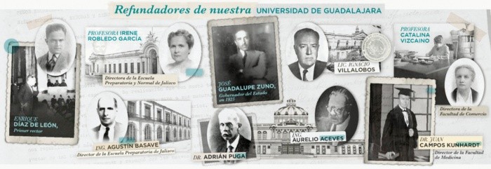 La refundación de la Universidad de Guadalajara en 1925, encabezada por el gobernador de Jalisco, José Guadalupe Zuno, y por el rector de la Universidad, Enrique Díaz de León.