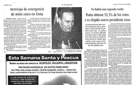 El 27 de marzo del año 2000, la portada de EL INFORMADOR anunciaba la victoria de Putin en las elecciones presidenciales celebradas un día antes, con más del 51% de los votos, con lo que se evitó una segunda vuelta. En la página 27 se lee la nota completa, en la que se detalla: “La popularidad del ahora primer mandatario electo, quien regirá a Rusia durante los próximos cuatro años, se reafirmó gracias a su postura inflexible en la guerra que se libra desde hace ocho meses en Chechenia contra presuntos rebeldes separatistas, y pese a que en estos enfrentamientos murieron casi dos mil soldados rusos”.