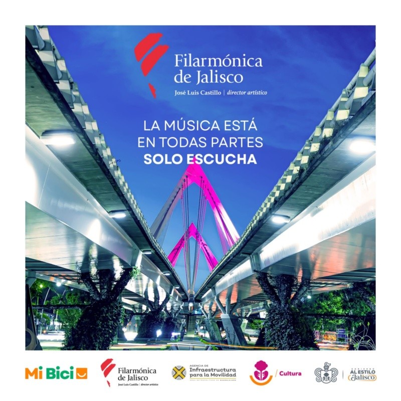 La música sinfónica y la movilidad sustentable se unen en una colaboración entre la Orquesta Filarmónica de Jalisco (OFJ) y el Sistema de Bicicletas Públicas MiBici, operado por la Agencia Metropolitana de Infraestructura para la Movilidad (AMIM). La alianza tiene como objetivo acercar a la ciudadanía a los recintos culturales y resignificar el espacio público a través de la movilidad activa.Como parte de esta iniciativa, se instalaron 30 carteles a lo largo de la Zona Metropolitana de Guadalajara. Las imágenes capturadas en ellos muestran postales de edificios públicos y espacios arquitectónicos emblemáticos que, al igual que la OFJ, forman parte del tejido cultural de Jalisco.Cada cartel incluye un código QR que redirige a una de las seis listas de reproducción especialmente seleccionadas por la orquesta. Las playlists abarcan diferentes temas como la naturaleza, la migración, la memoria y la diversidad, con piezas de distintos compositores y épocas. El objetivo es que, al escanear el código desde el celular, la música invite a vivir la ciudad desde otra perspectiva.“Esta es una propuesta sensorial que conecta los matices sonoros del entorno urbano con la música sinfónica”, explica José Luis Castillo, director artístico de la OFJ. “Los ritmos están en todas partes: en las celosías de Erich Coufal, en las fachadas de Luis Barragán e incluso en las disonancias del tráfico. Para escucharlo, sólo hay que permitirnos hacerlo”, reflexiona.La campaña busca acompañar con música a los más de 21 mil usuarios activos del sistema MiBici y al flujo peatonal en los alrededores de sus estaciones. Las listas de reproducción pueden disfrutarse mientras se pedalea o se camina por la ciudad, favoreciendo una conexión más íntima con el entorno y su historia.El centro de Guadalajara fue elegido como una de las zonas clave para este proyecto. El polígono del primer cuadro de la ciudad es uno de los que genera más viajes en bicicleta y cuenta con 20 estaciones de MiBici, además de una flota de más de 250 bicicletas disponibles en las inmediaciones del Teatro Degollado.A ello se suma la infraestructura ciclista ya existente, como la ciclovía de Paseo Alcalde o el bus bici de Avenida Hidalgo, que hacen posible el acceso al recinto cultural desde distintos puntos de la ciudad.“Queremos que las personas que usan bicicleta se acerquen a la cultura desde la ciudad misma. No hay que entrar al teatro para sentir la música, basta con abrir los oídos y recorrer”, enfatizó Castillo.En su primera década de operación, el sistema MiBici ha contabilizado más de 33 millones de viajes en la metrópoli. Actualmente dispone de 368 estaciones y una flota que supera las 4 mil bicicletas, lo que la convierte en una de las principales plataformas de movilidad activa en América Latina.Las listas de reproducción se pueden escuchar aquí.NA