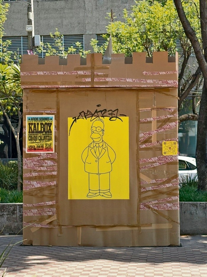 Las estructuras —mamparas forradas con cartón, cinta canela, etiquetas de “frágil”, impresiones gráficas y frases que remiten tanto al meme como al slogan publicitario— funcionan como una especie de anti-monumento. Exhiben la precariedad como lenguaje y convierten el desecho en signo. Guerrerosantos lo plantea como una reapropiación crítica de un mobiliario urbano que normalmente nadie mira: esos mini espectaculares anodinos, diseñados para comunicar poco y mal, que pueblan la ciudad sin provocar pensamiento alguno.
