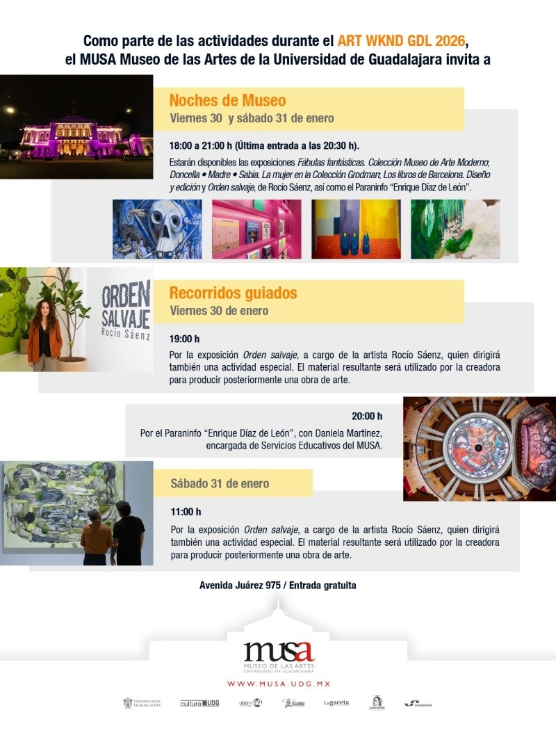 En el marco de un fin de semana marcado por actividades artísticas en la ciudad, el MUSA Museo de las Artes de la Universidad de Guadalajara anunció la realización de Noches de Museo con horario extendido y programación especial los días 30 y 31 de enero. La iniciativa busca ampliar el acceso del público a sus exposiciones y sumarse a la dinámica cultural que acompaña al ART WKND GDL 2026.Durante ambas jornadas, el recinto universitario abrirá de 10:00 a 21:00 horas, con última entrada a las 20:30, lo que permitirá a visitantes, asistentes y participantes del encuentro artístico recorrer las salas del museo fuera de su horario habitual. Además de la apertura extendida, se ofrecerán recorridos guiados y actividades vinculadas a una de las exposiciones en curso.La primera jornada especial se llevará a cabo el viernes 30 de enero. Ese día, el museo mantendrá abiertas todas sus exposiciones y ofrecerá dos recorridos guiados vespertinos. A las 19:00 horas se realizará un recorrido por la muestra Orden salvaje, encabezado por la creadora Rocío Sáenz, quien compartirá detalles sobre su proceso de trabajo y dirigirá una actividad especial con los asistentes. El material generado durante esta dinámica formará parte de una obra que será producida posteriormente.Más tarde, a las 20:00 horas, se llevará a cabo un segundo recorrido guiado, a cargo de Daniela Martínez, responsable de Servicios Educativos del MUSA. Este recorrido estará enfocado en las obras de José Clemente Orozco que se encuentran en el Paraninfo “Enrique Díaz de León”, espacio que alberga las primeras pinturas monumentales realizadas por el muralista jalisciense en Guadalajara. Durante la actividad se abordará el contexto y la relevancia de estas piezas dentro de la trayectoria del artista. El sábado 31 de enero, el museo mantendrá el mismo horario extendido, de 10:00 a 21:00 horas. En esta segunda jornada, la programación incluye un recorrido y actividad especial por la exposición Orden salvaje, nuevamente con la participación de Rocío Sáenz, programado a las 11:00 horas. Esta actividad permitirá a los asistentes acercarse al contenido de la muestra desde una perspectiva guiada y participativa.Además de las actividades programadas durante las Noches de Museo, el MUSA informó que a lo largo de toda la semana permanecerán abiertas sus exposiciones temporales. Entre ellas se encuentran Fábulas fantásticas. Colección Museo de Arte Moderno; Doncella • Madre • Sabia. La mujer en la Colección Grodman, que contará con un recorrido guiado el domingo 1 de febrero a las 11:00 horas; Los libros de Barcelona. Diseño y edición y Orden salvaje.El museo recordó que su ubicación es en Avenida Juárez 975, en el centro de Guadalajara. De manera regular, el MUSA abre de martes a sábado de 10:00 a 18:00 horas y los domingos de 10:00 a 15:00 horas. Tanto la entrada al recinto como la participación en las actividades programadas son gratuitas, lo que forma parte de la política de acceso abierto del espacio universitario.YC