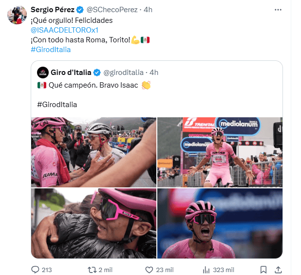 Checo Pérez felicita a Isaac del Toro por su triunfo en el Giro de Italia