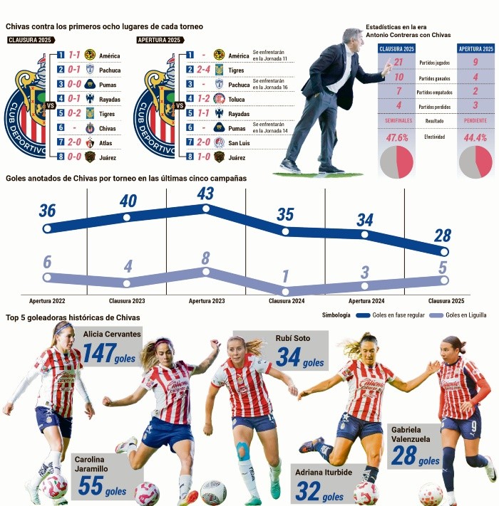 En la otra cara de la moneda, Chivas continúa sin saber lo que es vencer a escuadras como Tigres y Rayadas. Antonio Contreras no ha encontrado la fórmula de imponerse a conjuntos de mayor jerarquía o que cuentan con un proyecto más ambicioso, como es el caso de Toluca, al que tampoco pudo derrotar en la fecha 6.