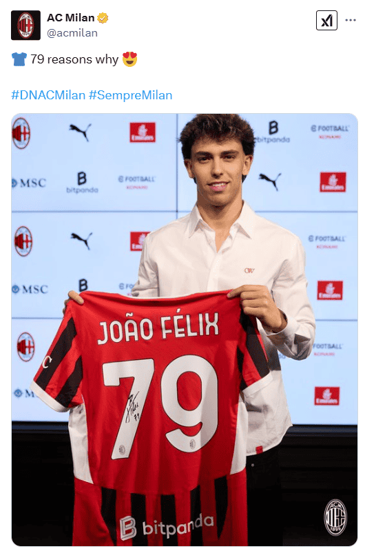 El AC Milan anunció este martes la llegada del delantero de la Selección de Portugal, João Félix, en calidad de préstamo hasta final de temporada, en la que llevará el número "79".El Milan se complace en anunciar el fichaje de João Félix Sequeira, procedente del Chelsea FC. El atacante portugués ha firmado un contrato con el club que se extenderá hasta el 30 de junio de 2025", informó el Milan.La operación se cerró de manera frenética durante la tarde del domingo, en el último día del mercado italiano, y el atacante luso aterrizó en el aeropuerto de Linate a las 22:20 (GMT +1) para firmar su contrato, en una operación relámpago que acabó como cesión hasta final de temporada sin opción de compra en verano y con unas cifras que rondarán los 5 millones de euros y el salario cubierto por los 'rossoneri'.Superó este martes las pruebas médicas, ya con el fichaje cerrado, se entrenará este mismo martes y su primer partido será ya este miércoles en Copa Italia ante el Roma, en el Estadio Giuseppe Meazza (San Siro).João Félix, ex del Benfica, Atlético de Madrid y Barcelona, con un papel secundario en el Chelsea, se encontrará en su nuevo equipo con la confianza de su compatriota Sergio Conceicao, nuevo técnico del Milan, y el apoyo del también luso Rafael Leao, el jugador más mediático del equipo.Además, el Milan, en plena reconstrucción también tras la salida de Davide Calabria, Álvaro Morata y Noah Okafor , así como la llegada de Kyle Walker, incorporó también a última hora a otro atacante para completar la ofensiva, Riccardo Sottil procedente del Fiorentina; y a un centrocampista, Warren Bondo procedente del Monza, para paliar la cesión de Bennacer al Marsella.Ayer también hizo oficial la contratación del mexicano Santiago Giménez, procedente del Feyenoord de Países Bajos.*Mantente al día con las noticias, únete a nuestro canal de WhatsAppOF