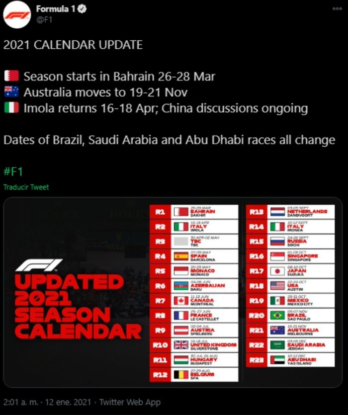 Los Grandes Premios de Fórmula 1 de Australia y China, previstos el 21 de marzo y el 11 de abril, se aplazaron al 21 de noviembre y a una fecha por determinar, mientras que el circuito de Imola entra en el calendario, anunció este martes la organización."La pandemia mundial aún no ha permitido que la vida vuelva a la normalidad, pero demostramos en 2020 que podemos correr con seguridad al ser el primer deporte internacional en regresar", dijo el presidente de la F1, Stefano Domenicali, en un comunicado.En el contexto de la pandemia del COVID-19, la temporada, que sigue con 23 Grandes Premios en teoría, comenzará así en Baréin el 28 de marzo en lugar de Melbourne, antes de viajar a Imola (Italia) el 18 de abril y a otro circuito todavía por determinar el 2 de mayo.Domenicali indicó que siguen conversando sobre el GP de China, previsto en Shanghái y que, según un comunicado de la F1, podría celebrarse "más adelante en la temporada si es posible", en referencia a las restricciones para viajar.Para dejar un lugar al GP de Australia en la recta final de la temporada, la organización adelantó una semana, al 7 de noviembre, el GP de Brasil, mientras que el de Arabia Saudita pasará del 28 de noviembre al 5 de diciembre.El campeonato terminará el 12 de diciembre en Abu Dabi.OF