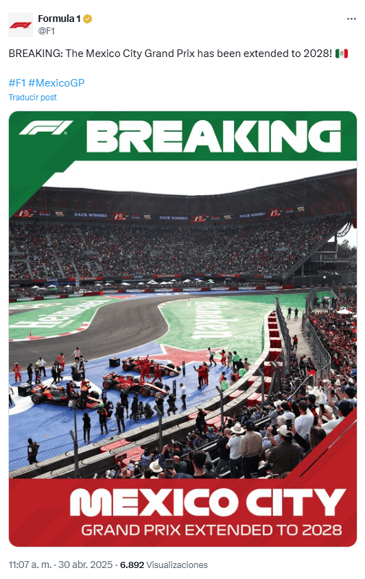 Este miércoles 30 de abril, la Fórmula 1 (F1) anunció que el Gran Premio de la Ciudad de México se mantendrá en el calendario, ya que se firmó una extensión del contrato por tres años a partir de 2026.