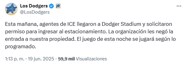 "Esta mañana, agentes del ICE se presentaron en el Dodger Stadium y solicitaron permiso para acceder a los estacionamientos. La organización les negó la entrada al recinto. El partido de esta noche se jugará como estaba programado", dijo el equipo en un post en X.