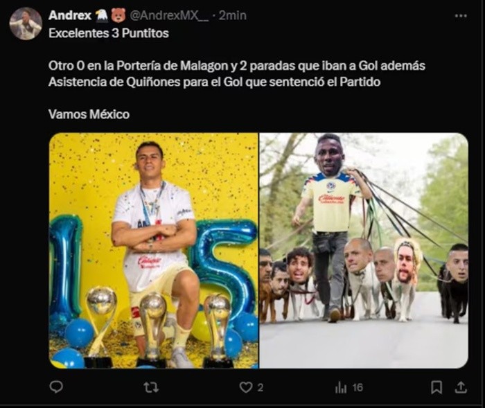 Este miércoles la Selección Mexicana logró derrotar a Surinam en la segunda jornada de la fase de grupos de la Copa Oro, pero no logró convencer a los aficionados tricolores.Después del sufrido triunfo sobre República Dominicana, el público mexicano esperaba un despliegue dominante del equipo dirigido por Javier Aguirre y si bien en el segundo tiempo así fue, la primera parte no fue sencilla para México.De inmediato, la afición festejó en redes sociales con los mejores memes por la victoria del Tricolor. Hubo aficionados que expresaron su felicidad por la victoria, otros su molestia por no tener un resultado más abultado.Aficionados americanistas destacaron la actuación de Ángel Malagón, aunque no fue exigido en gran parte del partido.Otro sector de aficionados mostró preocupación por lo que podría pasar en el Mundial del 2026 si México sigue jugando como lo hizo contra República Dominicana y Surinam en esta Copa Oro..