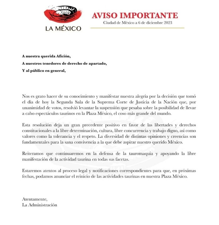 Mediante una carta emitida en redes sociales, la administración de la Plaza de Toros México ha informado este miércoles, que la Segunda Sala de la Suprema Corte de Justicia de la Nación resolvió por unanimidad de votos, levantar la suspensión que pesaba sobre la Plaza de Toreos más grande del mundo, por lo que los espectáculos taurinos regresan a la CDMX.Se informó que “esta resolución deja un gran precedente positivo en favor de las libertades y derechos constitucionales a la libre determinación, cultura, libre concurrencia y trabajo digno, así como valores como la tolerancia y el respeto”.El proceso legal continúa, sin embargo, en los próximos días se dará a conocer el reinicio de las actividades taurinas en la Plaza México.En tanto, en la Plaza de Toros Nuevo Progreso de Guadalajara, la suspensión continúa. Cabe recordar que las últimas dos corridas del año fueron canceladas en el coso tapatío.SV