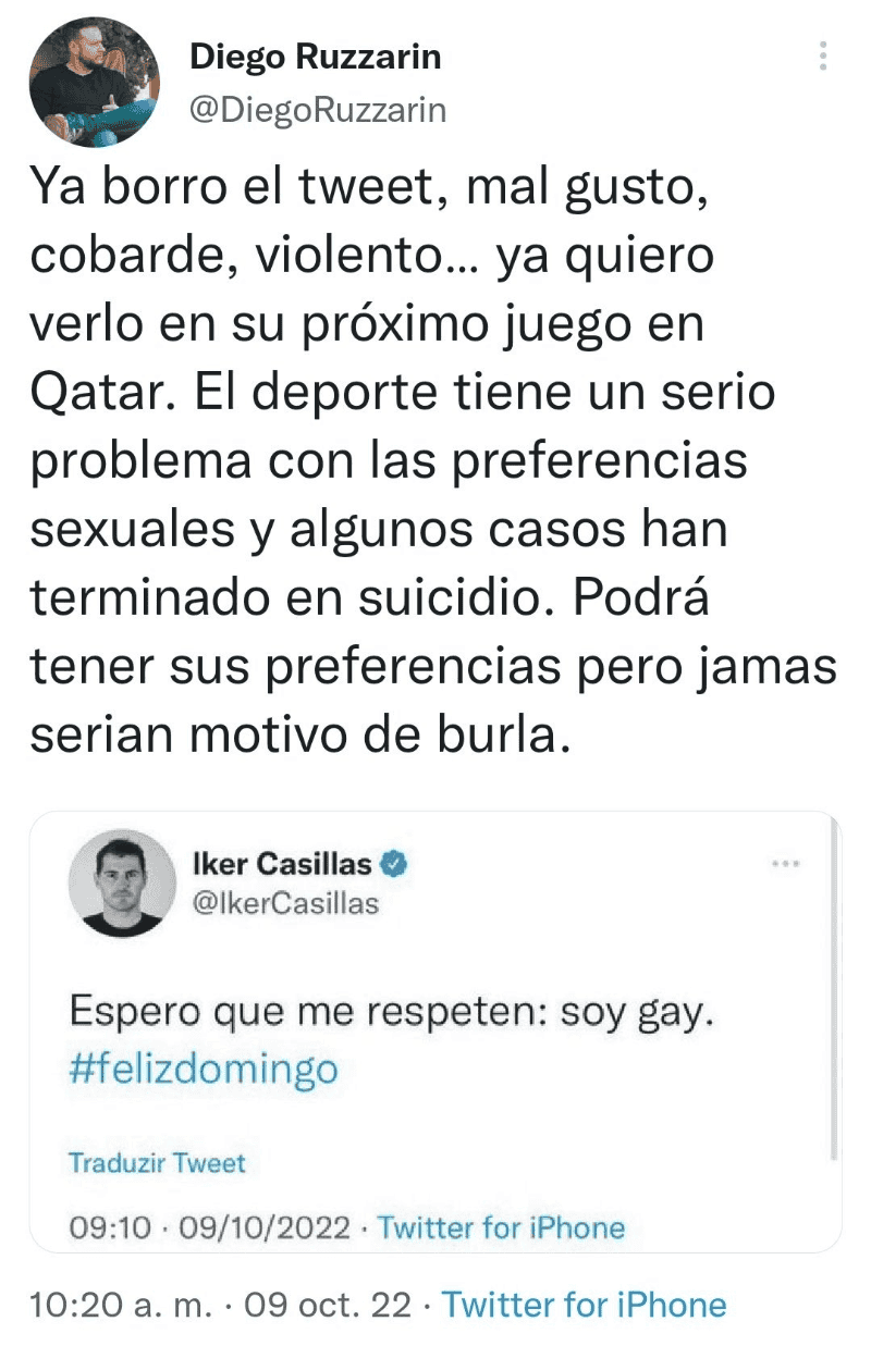 Tan mal le fue al influencer Diego Ruzzarin en un reciente comentario en las redes sociales que mejor decidió poner privada su cuenta de Twitter.Y es que todo comenzó cuando el invitado de TUDN para el Mundial de Qatar 2022 se subió al barco y criticó a Iker Casillas por aquel tuit que aparecía en su cuenta que decía: "Espero que me respeten: soy gay".Diego Ruzzarin, luego de que Iker Casillas eliminara la publicación, escribió: "Ya borró el tweet, mal gusto, cobarde, violento... ya quiero verlo en su próximo juego en Qatar. El deporte tiene un serio problema con las preferencias sexuales y algunos casos han terminado en suicidio. Podrá tener sus preferencias pero jamás serian motivo de burla (sic)".Esto de inmediato hizo que los usuarios de las redes sociales lo reventaran e incluso hicieran comentarios en tono de burla al respecto, pues quedó demostrado que irá a Qatar 2022 como invitado sin saber que Iker Casillas ya está retirado del futbol.OF