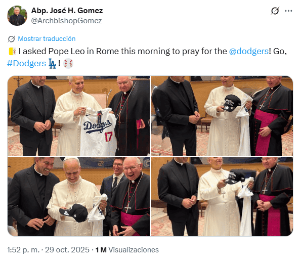 Los Toronto Blue Jays lograron ayer 29 de octubre una contundente victoria de 6-1 ante los Dodgers en Los Ángeles y están a solo un triunfo de conquistar en 2025 su primera Serie Mundial desde 1993.La novena canadiense, apoyada en una actuación récord de su lanzador novato Trey Yesavage, lidera el Clásico de Otoño de las Grandes Ligas 3-2 y tendrá la primera oportunidad de ganar el título el viernes frente a su público.Shohei Ohtani y el resto de figuras de los Dodgers se estrellaron el miércoles contra Yesavage, que llegó a 12 ponches. El ataque canadiense lo lideró Vladimir Guerrero Jr. con uno de los dos jonrones visitantes en la primera entrada.Los Blue Jays tienen completamente acorralados a los Dodgers, que están obligados a ganar dos partidos consecutivos en Toronto el viernes y sábado para ser los primeros bicampeones en un cuarto de siglo.Curiosamente, a través de las redes sociales comenzaron a circular unas imágenes del Papa León XIV, quien hace unos días recibió una franela de la novena de Los Ángeles, particularmente con el número de la estrella japonesa, Shohei Ohtani.De inmediato, en las redes iniciaron las reacciones por parte de los usuarios, quienes bromearon con la posibilidad de que los Dodgers estarían pidiendo un favor divino para salir avante ante el reto que tienen enfrente con el conjunto de Toronto.Desde su llegada al Vaticano, el Papa León XIV ha llamado la atención por su interés en el deporte, especialmente el beisbol, siendo fanático de los White Sox. Y aunque su equipo no está en la Serie Mundial, León XIV recibió una camisola de los Dodgers, pero no por parte del equipo de la MLB, sino como un obsequio del arzobispo de Los Ángeles.*Mantente al día con las noticias, únete a nuestro canal de WhatsAppOF