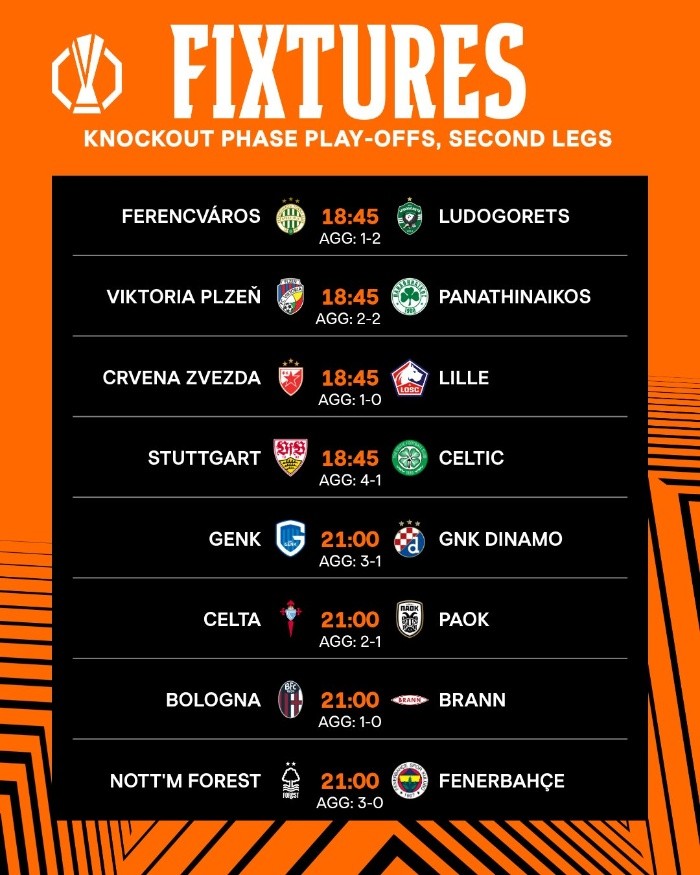 Los últimos lugares disponibles para los octavos de final de la Europa League se disputarán este jueves en los juegos de vuelta de las series de playoffs.El Stuttgart, con ventaja de 4-1 sobre el Celtic, y el Nottingham Forest, que venció 3-0 al Fenerbahçe en la ida, parecen tener la eliminatoria definida a su favor; lo mismo ocurre con el Genk de Bélgica, que llegará a su estadio con el marcador global 3-1 sobre el Dinamo de Zagreb.Las otras series están abiertas.El Celta de Vigo tendrá la ventaja de cerrar como local, pero la diferencia en el marcador es de solo un gol, tras el 2-1 con el que venció al PAOK de Salónica en el primer juego. En esta etapa del torneo, en la que el gol de visitante ya no es criterio de desempate, un empate en el marcador global obliga a disputar tiempo extra.En circunstancias prácticamente iguales se encuentran el Bolonia, que venció 1-0 al Brann de Noruega, y la Estrella Roja de Belgrado, que también derrotó 1-0 al Lille.El Ludogorets de Bulgaria ganó en la ida 2-1 al Ferencváros de Hungría, pero cerrará la serie como visitante en Budapest, lo que reduce la sensación de ventaja.El juego entre el Panathinaikos de Grecia y el Viktoria Plzeň de la República Checa arrancará parejo, después del empate 2-2 de la semana pasada.En los octavos de final los esperan los primeros ocho lugares de la fase de liga:11:45 horasEstrella Roja vs. LilleFerencváros vs. LudogoretsStuttgart vs. CelticViktoria Plzeň vs. Panathinaikos14:00 horasGenk vs. Dinamo de ZagrebCelta de Vigo vs. PAOKBolonia vs. BrannNottingham Forest vs. Fenerbahçe