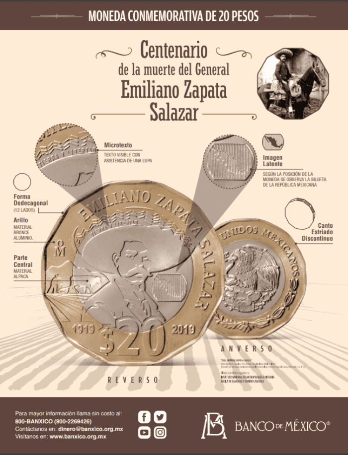 Se trata de una moneda conmemorativa de la Revolución Mexicana, específicamente es aquella que conmemora el centenario de la muerte del general Emiliano Zapata, la cual se puso en circulación el 12 de abril de 2021 de manera limitada.