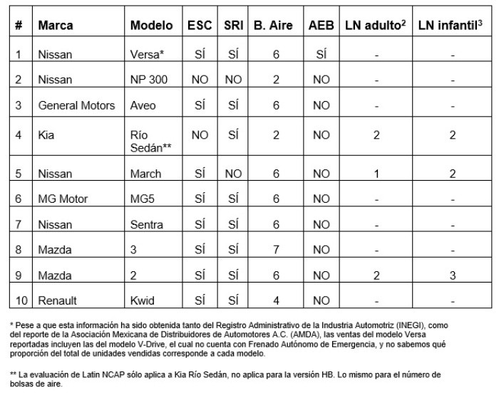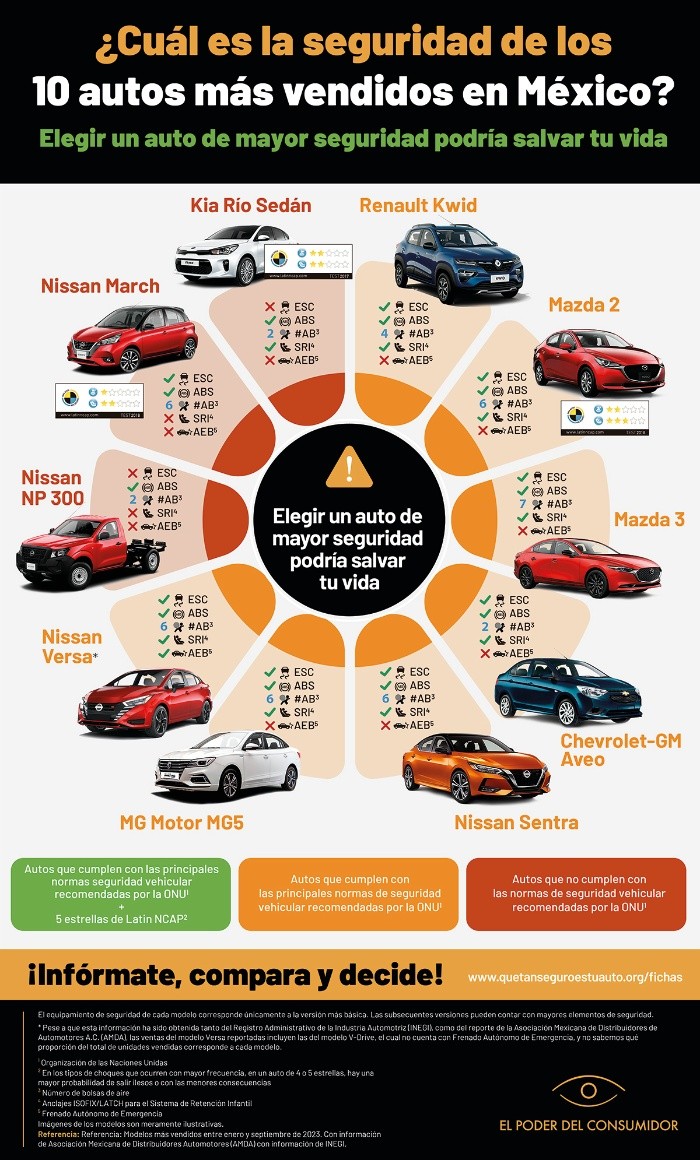 De acuerdo con un estudio publicado por la asociación civil El Poder del Consumidor, ninguno de los 10 autos más vendidos en México en este 2023 puede considerarse un auto de mayor seguridad para los consumidores.A esta conclusión llegaron, debido a que no cumplen con los elementos necesarios para ser considerados como seguros. No atienden las principales recomendaciones de seguridad vehicular de la Organización de las Naciones Unidas, ni cuentan con la calificación de 5 estrellas (la más alta) otorgada por el Programa de Evaluación de Autos Nuevos para América Latina y el Caribe (Latin NCAP), señala El Poder de Consumidor.La asociación presentó las fichas de seguridad vehicular de los modelos 2023-2024 que corresponden a la más reciente actualización del sitio “Qué tan seguro es tu auto”. El Poder del Consumidor analizó la seguridad de 169 modelos 2023-2024, que en su totalidad representan el 88.3% de las ventas realizadas de enero a septiembre de 2023. En dicho análisis demuestra que hay 21 modelos sin control electrónico de estabilidad (ESC); 16 no tienen cinturones de tres puntos en todas las plazas; 35 modelos aún no ofrecen anclajes Isofix/LATCH para los sistemas de retención infantil; 147 modelos no ofrecen frenado autónomo de emergencia (AEB).Entre las versiones básicas de los 10 modelos, solo dos — Kia Río Sedán y Nissan NP 300— no cuentan con Control Electrónico de Estabilidad (ESC). Dicha tecnología reduce hasta en un 80% la probabilidad de choque por derrape y volcaduras. Por otro lado, los modelos Nissan NP 300 y Kia Río Sedán solo incluyen 2 bolsas de aire mientras que el Renault Kwid cuenta con 4. Los modelos Nissan Versa, March y Sentra, MG Motor MG5, Chevrolet-GM Aveo y Mazda 2 incluyen 6, mientras que el Mazda 3 cuenta con 7 bolsas de aire. Además, dos de los modelos más vendidos, Nissan NP 300 (redilas) y Nissan March, aún no disponen de los anclajes para la instalación de un Sistema de Retención Infantil, para proteger la seguridad de un infante en el tránsito.