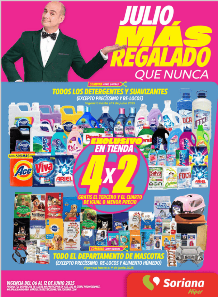 ¡Llegó la cuponera más esperada de Julio Regalado en Soriana! Del 6 al 12 de junio disfruta de descuentos exclusivos en tus marcas y productos favoritos, desde alimentos esenciales y bebidas refrescantes hasta artículos de limpieza y cuidado personal, encontrarás ofertas irresistibles que te permitirán llevar más por menos. Esta tercera cuponera de Julio Regalado se dio a conocer en el portal oficial de Soriana, la cual puedes consultar aquí. Algunas de las ofertas de la tercera cuponera de Julio Regalado de Soriana son las siguientes: Todas las tiendas Soriana Híper, Soriana Súper, Soriana Mercado, Soriana Express, MEGA Soriana y Soriana.com.En esta temporada de descuentos se aceptan tarjetas de crédito Visa o Mastercard, American Express, Tarjeta Recompensas Soriana o PayPal.NA