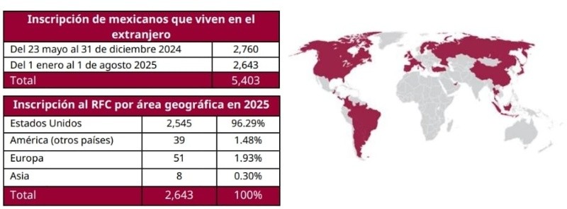 En tanto, del 1 de enero al 1 de agosto de 2025, se han inscrito al RFC por este canal de atención 2 mil 643 personas mexicanas en el extranjero con residencia en 43 países, siendo Estados Unidos el principal con 2 mil 545 trámites realizados desde 48 ciudades.