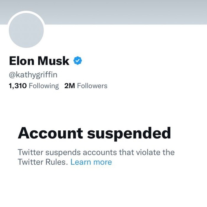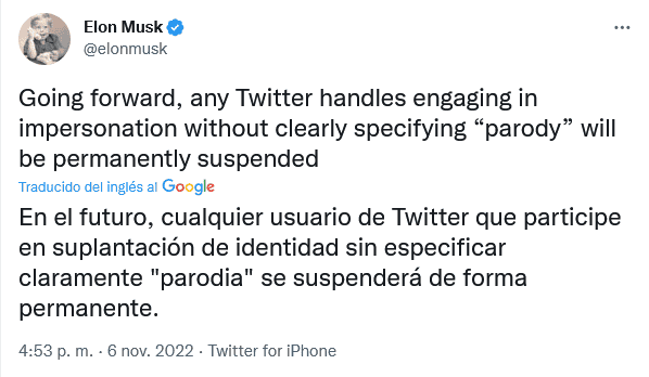 Elon Musk dijo ayer domingo que Twitter suspenderá permanentemente de la plataforma a cualquier cuenta que se haga pasar por otra.El nuevo propietario de la plataforma emitió su advertencia después de que algunas celebridades cambiaron sus nombres de pantalla, pero no el nombre de sus cuentas, y tuitearon como "Elon Musk" como respuesta a la decisión del empresario de ofrecer cuentas verificadas a cambio de una cuota de ocho dólares mensuales mientras al mismo tiempo despedía a una buena parte de la plantilla laboral de la compañía."De ahora en adelante, cualquier cuenta de Twitter que se haga pasar por otra sin especificar claramente que es una 'parodia' quedará suspendida de forma permanente", escribió Musk. Aunque Twitter emitía advertencias antes de una suspensión, ahora que está ofreciendo "verificación a gran escala, no habrá advertencias".De hecho, "cualquier cambio de nombre" supondría una pérdida temporal de la marca de verificación, declaró Musk, el hombre más rico del mundo.La cuenta de la comediante Kathy Griffin fue suspendida ayer después de que cambió su nombre de pantalla a Musk. Le dijo a un reportero de Bloomberg que también había usado la foto de perfil de Musk."Supongo que no despidió a todos los moderadores de contenido", bromeó posteriormente Griffin en Mastodon, una plataforma de redes sociales en la que creó un perfil la semana pasada.La actriz Valerie Bertinelli de igual forma adoptó el nombre de pantalla de Musk, publicando una serie de tuits en apoyo a candidatos demócratas el sábado antes de retomar su verdadero nombre. "Muy bien, fue divertido y creo que dejé en claro mi punto", tuiteó posteriormente.Antes de todo esto, Bertinelli destacó el propósito original de la marca azul de verificación. Se le otorgaba sin costo alguno a personas cuya identidad era confirmada por empleados de Twitter; y una buena parte de las cuentas verificadas pertenecían a periodistas."Simplemente, significaba que tu identidad estaba verificada. A los embaucadores les costaba más trabajo suplantarte", dijo Bertinelli."Pero ese ya no es el caso. ¡Buena suerte a todos!", añadió.OF