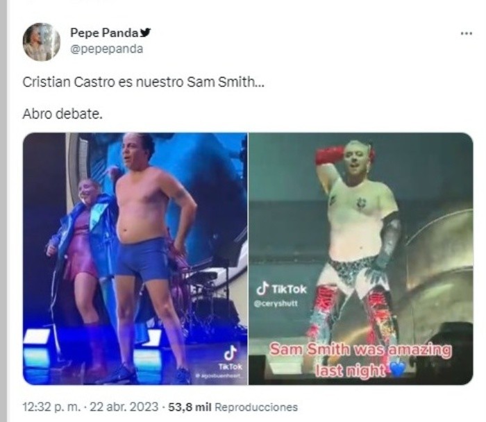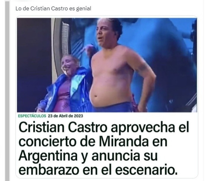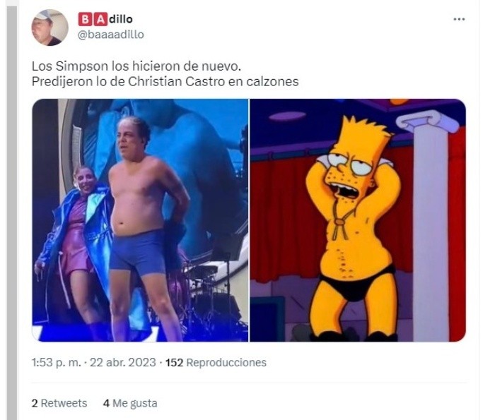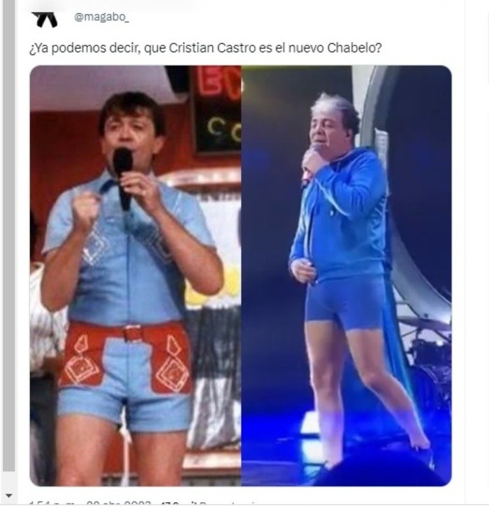 El cantante Christian Castro ha sido el centro de atención debido a una nueva polémica, pues se quitó la ropa en un concierto con el grupo argentino Miranda y su aspecto físico dio de que hablar en las redes sociales.En el video que se difundió en internet se puede ver cómo Christian Castro se va quitando la ropa mientras el público grita.Al final el cantante queda sólo en ropa interior color azul.Por lo anterior, el internet hizo su magia y estos son los memes que han dado la vuelta en Twitter: