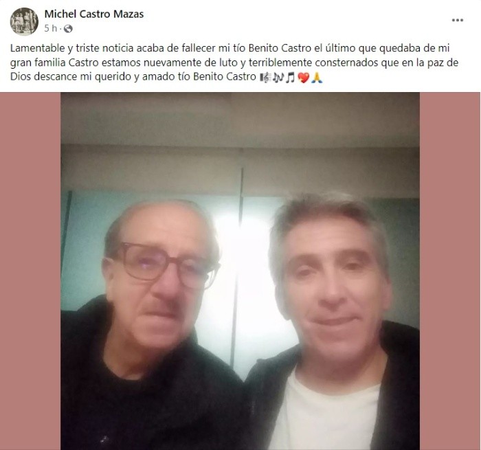 La tarde de este lunes se dio a conocer el fallecimiento de Benito Castro a los 77 años de edad, quien destaca en el mundo de la actuación, como músico, compositor y comediante en México. Fue su sobrino, Michelle Castro, quien compartió un mensaje a través de sus redes sociales dando a conocer la lamentable noticia y mencionando que fue el último en irse de los hermanos Castro."Lamentable y triste noticia acaba de fallecer mi tío Benito Castro, el último que quedaba de mi gran familia Castro. Estamos nuevamente de luto y terriblemente consternados. Que en la paz de Dios descanse mi querido y amado tío Benito Castro", escribió Michelle. Minutos más tarde, Deborah Castro, hija del también cantante mexicano, confirmó la noticia al programa “Ventaneando” sobre el deceso de su padre, quien de acuerdo con su versión sufrió un accidente en el interior de su domicilio. "Soy su hija Deborah Castro lamento mucho informar que sí, mi papá falleció, tuvo un accidente se cayó de las escaleras de la casa y no resistió", afirmó. Finalmente dio a conocer que el cuerpo de Benito será velado en las Funerarias García López, además de que planea hacerle un homenaje por la grande y exitosa trayectoria artística que tuvo por muchos años.MF