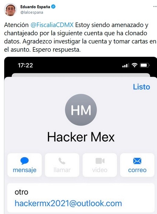 A través de sus redes sociales este fin de semana el actor y comediante Lalo España compartió la mala experiencia que está pasando al ser amenazado y chantajeado.Si bien no puede dar más detalles por el momento, sí señala que se asustó mucho.El trabajo de España se puede ver actualmente dentro del programa "Vecinos", donde interpreta a Gernán Martínez, además entre sus personajes más conocidos está el de Doña Márgara Francisca, mismo que se remonta a las épocas en que formó parte del elenco de "Otro rollo".En una publicación de Twitter en la que etiquetó a la Fiscalía de la Ciudad de México, Lalo detalló este fin de semana que una cuenta llamada "Hacker mex" ha clonado sus datos.Afortunadamente el comediante ya se encuentra en un proceso de denuncia formal y activando procedimientos de seguridad en sus dispositivos; sin embargo, es un tema del que aún no puede dar detalles hasta que avance la investigación."Ahorita no le veo mucho caso (hablar) porque estoy a medias de proceso de denuncias de manera formal entonces no quisiera moverle ahorita", señala en entrevista."La verdad me asusté mucho y fue muy desagradable la experiencia", señaló en entrevista.En los últimos meses, España también causó ruido cuando en noviembre compartió que había dado positivo al COVID-19."De momento me siento triste y no sé cómo acomodar los pensamientos y las emociones", señaló en su momento a través de Twitter.jb