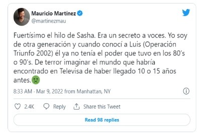 Antonio Berumen, mejor conocido en la industria del entretenimiento en México como “Toño”, fue un productor musical que en los 90 lanzó con éxito a agrupaciones como “Magneto”, “Mercurio” y “Kairo”, entre otros proyectos musicales. Y ahora que Sasha Sokol habló de su historia de abuso por parte del también productor Luis de Llano, el actor y cantante Mauricio Martínez se solidarizó con la ex Timbiriche y a través de su cuenta de Twitter, narró un incómodo momento que tuvo con Toño Berumen.“Si un hombre de 39 años seduce y enamora a una niña de 14, eso se llama abuso y además es un delito muy grave. Nada de ‘búsqueda de una imagen paterna’", refirió Martínez, pues de Llano fue lo que le externó a Yordi Rosado cuando habló de su relación con Sasha. “Ahí no hay absolutamente nada paternal. Le destrozaron la vida a una niña. Y se atreven a decir que el catálogo no existe…”“Fuertísimo el hilo de Sasha. Era un secreto a voces. Yo soy de otra generación y cuando conocí a Luis (Operación Triunfo 2002) él ya no tenía el poder que tuvo en los 80’s o 90’s. De terror imaginar el mundo que habría encontrado en Televisa de haber llegado 10 o 15 años antes”.Entonces, relató el hostigamiento del que fue víctima por parte de Berumen: “El mismo año de ‘Operación Triunfo’ (reaily en el que estuvo), estudié 6 meses en el CEA. Un compañero que sabía que también cantaba me presentó a Toño Berumen… pregúntenle cómo le fue el día que se le fue la mano a donde no debía a ese cerdo. Yo era un adulto de 23 años y me pude defender. ¿Pero cuantos no? Por eso no le creo NADA a (Eduardo) Verástegui. Él sigue en contacto con Berumen y se hacen los de la vela perpetua. ¡Toño hasta trabajó (o trabaja) con el Vaticano! Pero bien que tenía cámara en el baño para ver a jóvenes bañarse. A mí nadie me lo cuenta. Yo lo vi con mis propios ojos”.Sin embargo, reiteró que en la empresa Televisa sí hay gente profesional y correcta. “No, no todo Televisa ‘está podrido’ como he leído varías veces por aquí a raíz del hilo de Sasha. Yo conocí a grandes personas en esa empresa que hasta el día de hoy son amigos cercanos y muy queridos. Y son personas profesionales con carreras y ética intachables. No generalicen”.Más tarde compartió que lo han estado buscando distintos medios para que ofrezca declaraciones. “Me han hablado de siete medios mexicanos en la última hora. Todo está ahí en mis tuits. No pienso dar entrevistas al respecto. No perdamos el foco. Aquí la víctima es @SashaSokol.No desvíen el tema y no minimicen su caso. Es muy valiente y requiere de todo su apoyo. Yo no tengo nada que ver con su caso y no me corresponde hablar al respecto. No es mi amiga, no la conozco pero aun así la apoyo al 100%. Créanle a las víctimas. Del otro tema, está más que claro en mis tuits y no hay nada más que agregar. Les mando un abrazo muy fuerte desde NY. ¡Que bárbaros!”.Hace casi un año otros medios como “Chisme No Like” y “TV Notas” habían publicado que Berumen había hecho prácticas en la que incurría en acoso sexual e intento de abuso, además relacionados con temas religiosos donde incluía a seminaristas y a los integrantes de sus bandas.MF