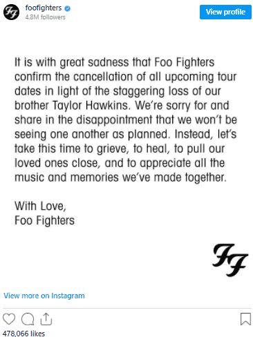 Este martes, la banda de rock Foo Fighters anunció "con gran tristeza" la cancelación del resto de fechas de su gira. Esto tras la muerte repentina del baterista Taylor Hawkins."Con gran tristeza, Foo Fighters confirma la cancelación de las próximas fechas de la gira tras la inesperada pérdida de nuestro hermano Taylor Hawkins", comunicaron en redes sociales la banda.Hawkins falleció a sus 50 años en un hotel de Bogotá, Colombia. La agrupación se encontraba en el país latinoamericano para actuar en el Festival Estéreo Picnic. La banda tenía previsto clausurar el Festival Estéreo Picnic, pero poco antes de subir al escenario, responsables de la organización anunciaron la noticia y pidieron un minuto de silencio en homenaje al batería, que fue respetado por un público conmocionado.Foo Fighters estaba de gira en Latinoamérica, donde había hecho disfrutar al público de festivales tan reconocidos como el Lollapalooza en Chile y en Argentina.Oficialmente, aún se desconoce la causa de la muerte de Hawkins, pero el estudio preliminar que la Fiscalía General de Colombia hizo público el sábado señalaba que encontraron en el cuerpo del artista sustancias derivadas de marihuana, opioides y antidepresivos en una prueba toxicológica de orina. AF