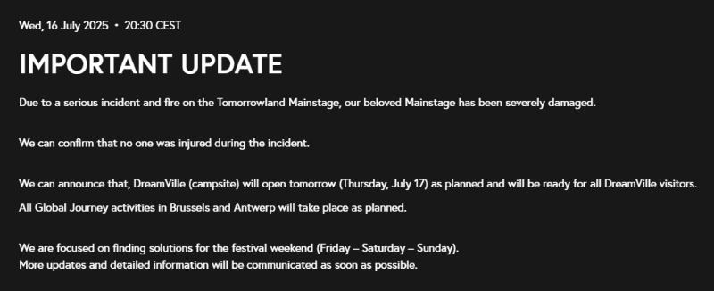 Uno de los escenarios del festival de música Tomorrowland que se celebra cada año en Bélgica ha sufrido un impactante incendio a días de que inicien los espectáculos. Las imágenes han sido compartidas en redes sociales y rápidamente se han viralizado por las impresionantes llamas que alcanzan gran altura y consumen un escenario gigantesco.El suceso ocurre a dos días de que comience Tomorrowland. El festival musical está agendado del viernes 18 de julio al domingo 27 del mismo mes en Bélgica.A través de la página oficial del Tomorrowland se ha compartido la siguiente informacón:“Debido a un fuerte incendio el escenario principal del Tomorrowland resultó con daños severos. Podemos confirmar que no hay heridos por el incidente.”“DreamVille (espacio para acampar) abrirá mañana jueves 17 como estaba planeado y estará listo para todos los visitantes. Todas las actividades en Brussels y Antwerp sucederán como estaban agendadas”. No obstante, aún no hay certeza sobre el festival Tomorrowland:“Estamos concentrados en encontrar una solución para los eventos del festival de este fin de semana. Más información sobre el futuro de Tomorrowland será comunicada tan rápido como sea posible”. En redes sociales circuló un supuesto comunicado que anunciaba la cancelación del festival. Sin embargo, hasta este momento, dicha información no se ha hecho oficial.* * * Mantente al día con las noticias, únete a nuestro canal de Whatsapp * * *OB