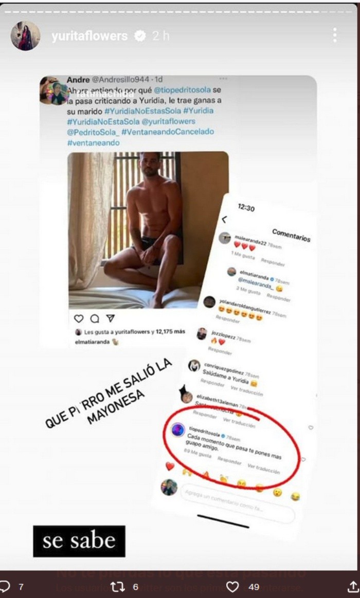 Pese a que Pati Chapoy y "Ventaneando" ya se disculparon públicamente con Yuridia, luego de que los comentarios que hizo acerca de su peso hace 18 años fueran revividos y duramente criticados por el público, la polémica pareciera no cesar, pues ahora la exacadémica mostró evidencia de que Pedro Sola comentó una de las publicaciones de su esposo Matías Aranda, donde le expresa lo guapo que es.Aunque Yuridia dijo que ya había perdonado a Pati Chapoy y la supuesta "campaña de desprestigio" que tramó contra ella hace casi 20 años, cuando la cantante salió de "La Academia", y, a su vez, la periodista mexicana y "Ventaneado" se disculparon con ella por el daño que sus comentarios pudieron causarle, tal parece que los problemas entre las partes están lejos de solucionarse.En "Ventaneando" se han hecho comentarios haciendo referencia indirecta del asedio de las redes sociales que, desde que explotó el escándalo, no han dejado de señalar a Pati Chapoy por su forma de dar los espectáculos, pues en la emisión de este martes, la conductora comentó que estas plataformas debían de utilizarse para exponer extorsiones o robo, a propósito de una noticia que estaba presentando, y no para otros usos que las personas les dan.Por su parte, Yuridia también sigue alimentado el tema, pues a cada comentario que se ha hecho de ella en el programa, no ha dudado en hacer réplica, reiterando que la forma en que actuó el programa de espectáculos la afectó profundamente, pero, ahora, los reclamos de la cantante llegaron a otro nivel cuando uno de sus seguidores le mando la evidencia de que descubrió a Pedro Sola "coqueteando" con su esposo.Luego de leer el comentario que Sola hizo a Matías, con quien está a la espera de su primer hijo juntos, la intérprete de "La maldita primavera" no dudo en compartir la imagen que documentaba las palabras del conductor, pues en ellas expresaba que el músico argentino se ponía cada vez más guapo en una fotografía en la que el músico aparece sin camisa, cumplido que parece que no le cayó en gracia a la artista mexicana.Pedro Sola escribió: "Cada momento que pasa, te pones más guapo, amigo".Al compartir la captura de pantalla, Yuridia solamente escribió la frase "Se sabe", dejando incertidumbre entre las y los internautas acerca de a qué se refería con dichas palabras.Yuridia y Matías Aranda se conocieron en 2010, durante las grabaciones de "Segunda oportunidad", un reality show de TV Azteca, en el que compartieron escenario, sin embargo, hay diferentes portales de internet que sugieren que, en esa época, eran tan sólo amigos y colaboradores, ya que el músico argentino se convirtió en manager de la cantante.Como ha dejado claro en los últimos días, Yuridia prefiere no hablar de su vida privada, sin embargo, no hace mucho ella y Matías compartieron que llevaban siete años de relación. También se conoce que en 2019 se casaron y ahora, la pareja está en la espera de su primer hijo en común, pues cabe recordar que cuando la cantante tenía 18 años tuvo a Phoenix, su primogénito, que tuvo a lado de Edgar Guerrero, otro exacadémico.Durante la polémica entre Yuri y "Ventaneando", Aranda se ha hecho presente mostrando su solidaridad a su pareja, pues la ha defendido exponiendo que, por años, el programa de espectáculos trató de perjudicarla, por lo que se sentía orgulloso de que ahora, la cantante saliera a hablar, hecho que la hacía admirarla más de lo que ya lo hacía.vll