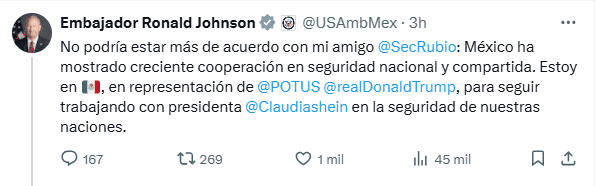 A través de una publicación en su cuenta de X (antes Twitter), el nuevo embajador de Estados Unidos en México, Ronald Johnson, compartió estar de acuerdo con su compañero Marco Rubio, secretario de Estado del país norteamericano, al referir que México ha cooperado en seguridad nacional y compartida.En el mensaje, el recién llegado a México tras asumir su cargo, dijo que está en nuestro país en representación de Donald Trump, para seguir trabajando con la presidenta Claudia Sheinbaum en la seguridad de ambas naciones.“No podría estar más de acuerdo con mi amigo Marco Rubio: México ha mostrado creciente cooperación en seguridad nacional y compartida. Estoy en México en representación de Donald Trump, para seguir trabajando con la Presidenta Claudia Sheinbaum en la seguridad de nuestras naciones”, escribió.El secretario de Estado de los Estados Unidos de América alabó a México por haber "aumentado su cooperación" en seguridad.De igual manera, Marco Rubio afirmó que tiene la intención de viajar al país latinoamericano en "las próximas semanas".Las acciones de Donald Trump, para pretender detener el cruce ilegal de personas a Estados Unidos desde la frontera sur de aquel país, así como el tráfico de fentanilo, han ido desde imponer aranceles hasta enviar tropas a la frontera con México.Las presiones arancelarias por el presidente Trump han hecho que México despliegue 10 mil soldados en su frontera norte, así como la entrega de 29 capos a la justicia estadounidense, además de reforzar sus operaciones antidrogas."Hemos tenido varios, diría yo, aspectos irritantes, pero también áreas de cooperación con el gobierno mexicano. De hecho, ha sido bastante positivo", resumió Marco Rubio durante una audiencia ante la Cámara de Representantes."Han aumentado su cooperación en materia de seguridad con nosotros de maneras muy productivas", añadió."De hecho, en algún momento de las próximas semanas tengo la intención de viajar posiblemente a México junto con otros miembros del gabinete para concretar algunas de estas áreas de cooperación", precisó.* * * Mantente al día con las noticias, únete a nuestro canal de WhatsApp * * *MB