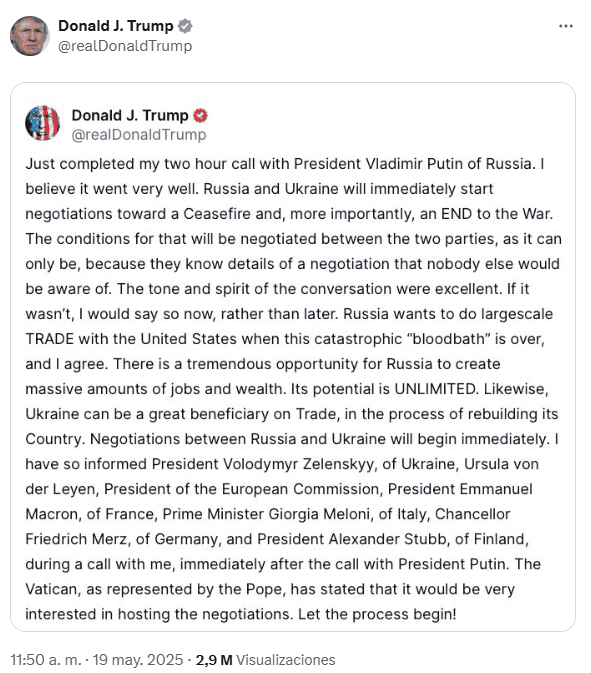 El presidente de Estados Unidos, Donald Trump, adelantó este lunes 19 de mayo tras haber hablado con sus homólogos ruso y ucraniano, Vladímir Putin y Volodímir Zelenski, que Ucrania y Rusia empezarán de inmediato, negociaciones de cara a un alto el fuego y, "todavía más importante", el fin de la guerra.