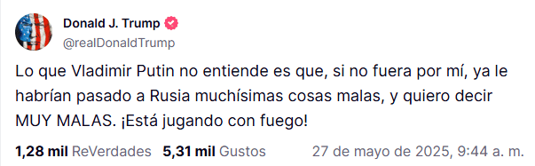 "Lo que Vladímir Putin no entiende es que, si no fuera por mí, a Rusia ya le habrían ocurrido muchísimas cosas malas, y quiero decir MUY MALAS. ¡Está jugando con fuego! ", afirmó Trump en la plataforma Truth Social.