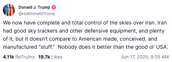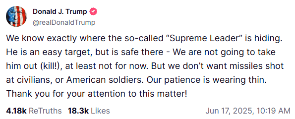 El presidente de Estados Unidos, Donald Trump, pidió la "rendición incondicional" de Irán luego de haber tomado control del espacio aéreo de dicho país y asegurar conocer la locación de Alí Jamaneí, líder supremo iraní. Los contundentes mensajes fueron compartidos a través de su perfil oficial de Truth Social.El primero de ellos, publicado hace una hora, dice lo siguiente:"Hemos tomado el control total del espacio aéreo sobre Irán. Irán tiene equipo defensivo poderoso y en grandes cantidades, pero nada en comparación con lo diseñado, concebido y hecho en Estados Unidos. Nadie lo hace mejor que el viejo EUA."El siguiente mensaje fue direccionado contra Alí Jamaneí, líder supremo iraní, en donde habló de la posibilidad de acabar con su vida:"Sabemos exactamente dónde se esconde el llamado 'Líder Supremo'", añadió Trump. "Es un objetivo fácil, pero está seguro allí. No vamos a eliminarlo (¡matarlo!), al menos no por ahora. Pero no queremos misiles disparados a civiles o soldados estadounidenses. Nuestra paciencia se está agotando".Por último, el presidente Trump exigió en mayúsculas y con exclamativas la "¡RENDICIÓN INCONDICIONAL!" de Irán, tras cinco días de escalamiento en el conflicto.Trump regresó a la Casa Blanca de su visita abreviada a la cumbre del G7 canadienses el martes temprano, en un momento decisivo de su presidencia. Israel, con cinco días de ataques con misiles, ha causado un daño considerable a Irán y cree que ahora puede asestar un golpe permanente a su programa nuclear especialmente si recibe un poco más de ayuda del presidente republicano.El presidente de Estados Unidos señaló que ahora buscaba "un verdadero fin" al conflicto y una "rendición completa" del programa nuclear de Teherán. "Deberían haber hecho el trato. Les dije, 'Hagan el trato'", declaró Trump a los periodistas en el Air Force One. "Así que no sé. No estoy muy dispuesto a negociar".Trump, quien planeaba reunirse con asesores en la Sala de Crisis, parece estar construyendo gradualmente el caso público para un papel estadounidense más directo en el conflicto. Su cambio de tono se produce cuando Estados Unidos ha reposicionado buques de guerra y aviones militares en la región para responder si el conflicto entre Israel e Irán se intensifica aún más.Con información de AP* * * Mantente al día con las noticias, únete a nuestro canal de Whatsapp * * *OB