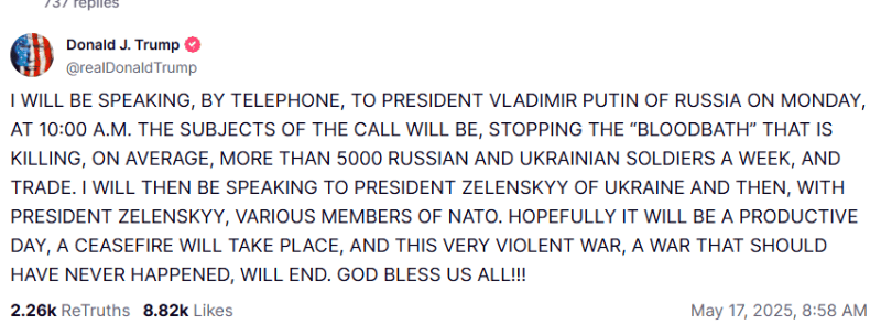 El presidente de Estados Unidos, Donald Trump, dijo hoy sábado que planea hablar por teléfono el próximo lunes 19 de mayo con su homólogo ruso Vladímir Putin, así como con el mandatario de Ucrania y con aliados de la OTAN, sobre el fin de lo que llamó un "baño de sangre" en Ucrania."Esperemos que sea un día productivo, que se logre un cese del fuego y que esta guerra tan violenta, una guerra que nunca debió ocurrir, llegue a su fin", escribió Trump en una publicación en su sitio de redes sociales Truth Social.Los comentarios de Trump se dieron menos de un día después de que las primeras negociaciones directas entre Moscú y Kiev en años no lograran un cese del fuego. Putin había rechazado la oferta del presidente ucraniano Volodímir Zelenski de reunirse cara a cara en Turquía después de que él mismo propusiera negociaciones en Estambul "sin condiciones previas" como alternativa al "cese del fuego total e incondicional" instado por Ucrania y sus aliados occidentales, incluido Estados Unidos.En tanto, un dron ruso alcanzó un autobús que evacuaba a civiles de una zona próxima al frente en la región de Sumy, en el noreste de Ucrania, este sábado más temprano, y causó la muerte de nueve personas, según funcionarios ucranianos, horas después de que las delegaciones rusas y ucranianas abandonaran Estambul tras acordar un gran intercambio de prisioneros de guerra.Otras siete personas resultaron heridas en el ataque en Bilopillia, una ciudad a unos 10 kilómetros de la frontera con Rusia, tres de ellas de gravedad, señalaron el gobernador, Oleh Hryhorov, y la policía nacional ucraniana. The Associated Press no pudo verificar de manera independiente los reportes y no hubo comentarios inmediatos de Moscú.El presidente de Ucrania, Volodímir Zelenski, calificó el ataque de "asesinato deliberado de civiles" y, en un mensaje en la aplicación de mensajería Telegram, agregó que "difícilmente los rusos podrían no darse cuenta de qué tipo de vehículo estaban atacando".El medio local Suspilne reportó que los pasajeros del autobús estaban siendo evacuados de la ciudad cuando se produjo el ataque. Las autoridades están trabajando para identificar a algunas de las víctimas, la mayoría de ellas mujeres ancianas. En Bilopillia se declaró luto oficial hasta el lunes.Zelenski lamentó la oportunidad perdida de las conversaciones de paz del viernes al asegurar que "Ucrania lleva mucho tiempo proponiendo esto: un alto el fuego total e incondicional para salvar vidas"."Rusia solo conserva la capacidad de seguir matando", agregó Zelenski.El secretario de Relaciones Exteriores del Reino Unido, David Lammy, dijo que estaba "horrorizado" por el ataque. "Si Putin habla en serio sobre la paz, Rusia debe acordar un cese del fuego total e inmediato, como lo ha hecho Ucrania", publicó en X.El Ministerio de Defensa ruso afirmó que sus fuerzas atacaron una zona militar en la región de Sumy este sábado por la mañana, a unos 50 kilómetros al sureste de Bilopillia, y no mencionó ningún otro ataque en la zona.Según un centro de estudios con sede en Washington, las fuerzas ucranianas han estado avanzando lentamente hacia territorio ruso en la región de Kursk, justo al norte de Bilopillia.Rusia afirmó el mes pasado que sus fuerzas recuperaron por completo el control de Kursk, casi nueve meses después de una incursión relámpago de Kiev que capturó más de 100 asentamientos y prometía dar a Ucrania una ventaja en posibles negociaciones con el Kremlin. Funcionarios ucranianos apuntaron que los combates en Kursk continúan.Los bombardeos, aviones no tripulados y ataques aéreos rusos, mataron al menos a cinco civiles más el viernes y durante la madrugada en las regiones de Donetsk, Járkiv y Jersón, según funcionarios locales. Las fuerzas rusas dispararon 62 drones durante la noche, informó la fuerza aérea de Ucrania. De ellos, 36 fueron derribados y otros seis se desviaron de su curso, probablemente debido a interferencias electrónicas.Las negociaciones celebradas en Estambul el viernes terminaron después de menos de dos horas sin un acuerdo de cese del fuego, aunque ambas partes acordaron intercambiar mil prisioneros de guerra por bando, según los jefes de ambas delegaciones, en lo que sería su mayor canje de este tipo. El jefe de inteligencia de Ucrania, Kyrylo Budanov, dijo en la televisión ucraniana el sábado que el intercambio podría ocurrir tan pronto como la próxima semana.Pero el Kremlin ha rechazado una propuesta de Ucrania y sus aliados occidentales para un cese del fuego temporal como primer paso hacia un acuerdo de paz.Zelenski dijo que había discutido el resultado de las conversaciones con Trump y los líderes de Francia, Alemania, Reino Unido y Polonia. En una publicación en X desde una reunión de líderes europeos en Albania el viernes, pidió "sanciones severas" contra el Kremlin si rechaza "un cese del fuego completo e incondicional y el fin de los asesinatos".El jefe de la delegación rusa, Vladímir Medinsky, un asesor de Putin, dijo que ambas partes también acordaron proporcionar propuestas detalladas de alto el fuego, y que Ucrania pidió la reunión de jefes de Estado, que Rusia tomó en consideración.El vocero del Kremlin, Dmitry Peskov, mantuvo abierta este sábado la posibilidad de un diálogo entre Putin y Zelenski, siempre y cuando el canje de prisioneros acordado se lleve a cabo y las delegaciones alcancen "acuerdos" adicionales no especificados.Peskov dijo también a los periodistas que Moscú le presentará a Kiev una lista de condiciones para un alto el fuego, pero no ofreció plazos ni concretó qué debe suceder antes de que los dos presidentes puedan reunirse.*Mantente al día con las noticias, únete a nuestro canal de WhatsAppOF