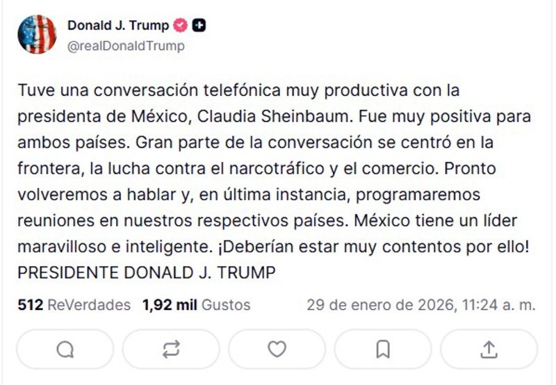 En un mensaje en su red Truth Social, el presidente de Estados Unidos, Donald Trump, habló de la llamada que sostuvo esta mañana con su homóloga mexicana, Claudia Sheinbaum Pardo, donde trataron cuestiones comerciales, fronterizas y sobre el tráfico de drogas.Tras el contacto bilateral, el Mandatario estadounidense afirmó que "México tiene una líder maravillosa y muy inteligente. ¡Deberían estar muy contentos con eso!", y agregó que volverán a conversar pronto.Asimismo, Trump consideró este diálogo como algo positivo para ambas naciones."Volveremos a hablar pronto y, en definitiva, organizaremos reuniones en nuestros respectivos países", garantizó Trump. Se trata de la segunda conversación en el último mes, después de la amenaza del estadounidense de atacar a cárteles del narcotráfico en México y en medio del inicio de la revisión del tratado comercial que sostienen ambas naciones con Canadá (T-MEC).La Gobernante mexicana calificó hoy la conversación como "productiva y cordial" y dijo que durante el diálogo se acordó mantener los canales de comunicación abiertos entre ambos gobiernos y que "ambos equipos seguirán trabajando conjuntamente".En el ámbito comercial, aseguró que aunque abordaron el tema del T-MEC, "todavía no hay nada concreto, pero se va avanzando muy bien".La llamada coincide con la visita del secretario de Economía mexicano, Marcelo Ebrard, a Washington, donde se ha reunido con su homólogo, Howard Lutnick, para avanzar asuntos comerciales bilaterales.En la llamada mantenida entre ambos el pasado 12 de enero, la Presidenta aseguró que quedó "descartada" una intervención militar en México, después de la captura y arresto del presidente venezolano depuesto, Nicolás Maduro, el pasado 3 de enero.* * * Mantente al día con las noticias, únete a nuestro canal de WhatsApp * * *MB