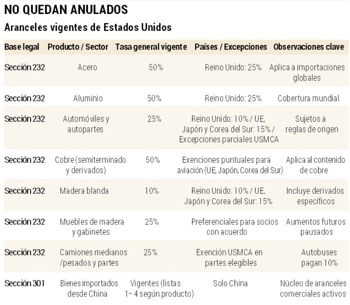 2) ¿Qué aranceles siguen vigentes? Siguen activos los impuestos a sectores estratégicos como acero, aluminio y autos.