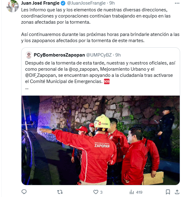 El día de ayer, el Área Metropolitana de Guadalajara (AMG) vivenció una de las tormentas más fuertes en lo que va del temporal, la cual dejó a su paso múltiples destrozos, especialmente en zonas del municipio de Zapopan.Cierre de vialidades, pasos a desnivel inundados, automóviles arrastrados y viviendas afectadas forman parte de la larga lista de daños por las precipitaciones.Una de las zonas más afectadas fue la colonia La Martinica, en donde el derrumbe de una barda en una bodega en las calles Rizo Ayala y Paseo de las Araucarias causó lesiones a cinco adultos y siete menores, provocando el fallecimiento de un bebé de tres meses de edad. Además, se estima que en esta zona la presencia de lluvias intensas causó daños de al menos 30 vehículos y un número al momento indeterminado de domicilios afectados, puesto que el nivel del agua alcanzó hasta los 4 metros.Ante los destrozos, personal operativo se encuentra realizando labores de atención a la emergencia, entre ellas evaluación de daños a la vivienda, saneamiento de vialidades y distribución de ayuda humanitaria. También se registraron inundaciones en los pasos a desnivel en la colonia Zapopan Centro y fraccionamiento Puerta de Hierro. Esta mañana, el alcalde de Zapopan, Juan José Frangie, se encuentra en la colonia La Martinica, en donde se evalúan los daños que la acumulación de agua dejó en múltiples viviendas. * * * Mantente al día con las noticias, únete a nuestro canal de WhatsApp * * *MB