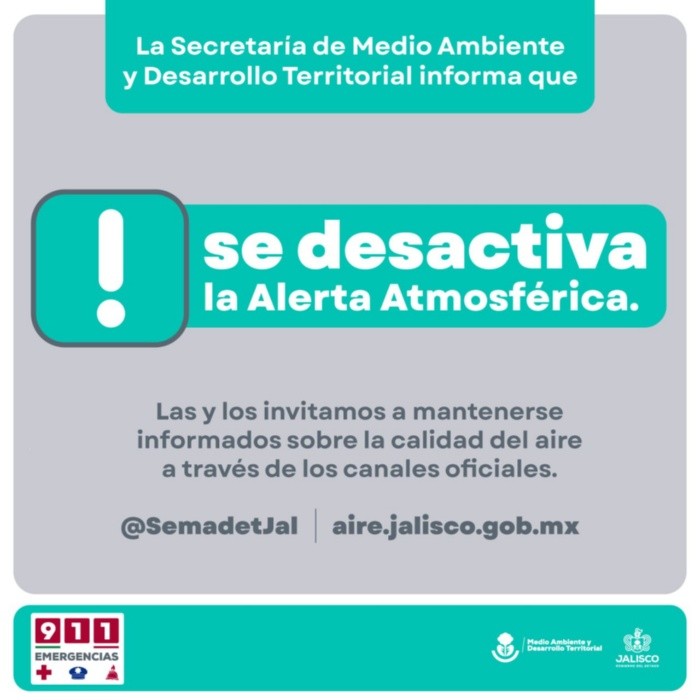 La Secretaría de Medio Ambiente y Desarrollo Territorial (Semadet) anunció que este martes en punto de las 18:00 horas desactivó las Alertas Atmosféricas que se mantenían en los municipios de Tala, Tlajomulco e Ixtlahuacán de los Membrillos.Estas alertas fueron emitidas debido a diversos incendios en las zonas mencionadas y a las condiciones atmosféricas que propiciaron la dispersión de humo en áreas circundantes, lo que representaba un riesgo potencial para la salud de la población cercana.Semadet insta a la ciudadanía a seguir las recomendaciones emitidas durante las Alertas Atmosféricas para minimizar la exposición al humo. Estas recomendaciones incluyen evitar actividades al aire libre, cerrar puertas y ventanas para impedir la entrada de contaminantes y mantenerse informado sobre la calidad del aire.Para consultar la calidad del aire en tiempo real y obtener información actualizada sobre episodios de mala calidad del aire, los ciudadanos pueden visitar el sitio web oficial de Semadet en https://aire.jalisco.gob.mx/ o seguir la cuenta de X @AireySaludAMG. YC