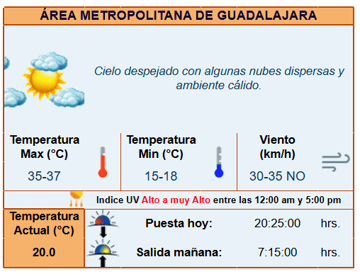Hoy 18 de mayo, Guadalajara tendrá condiciones meteorológicas estables, pero muy secas. De acuerdo con el Instituto de Astronomía y Meteorología (IAM), desde las primeras horas de la mañana, el cielo se presentará semi despejado, lo que permitirá un rápido aumento en la temperatura. Las mínimas rondarán los 15-18 °C durante la noche, brindando un inicio fresco antes de que el termómetro comience a elevarse. Conforme avance el día, las temperaturas alcanzarán máximas cercanas a los 35-37 °C.Este incremento se verá favorecido por la presencia de un sistema de alta presión que domina gran parte del occidente del país, lo cual también mantendrá la probabilidad de lluvias en niveles muy bajos. La entrada de humedad desde el Golfo de México y el Pacífico provocará nubosidad dispersa en otras regiones del país, pero en el caso de Jalisco, solo se prevén algunas nubes aisladas, sin riesgo de precipitaciones.Los vientos durante el día serán moderados, con ráfagas que podrían alcanzar entre 30 y 35 km/h, soplando principalmente desde el sur-suroeste. Durante la tarde y noche, las condiciones se mantendrán estables, con temperaturas descendiendo gradualmente hasta los 18 °C, ofreciendo un ambiente ligeramente más soportable. Es importante destacar que el índice de radiación ultravioleta (UV) alcanzará niveles muy altos durante las horas centrales del día, entre las 12:00 y las 17:00 horas. Con Información del Instituto de Astronomía y Meteorológica de la Universidad de Guadalajara y el Servicio Meteorológico Nacional.*Mantente al día con las noticias, únete a nuestro canal de WhatsApp. AO