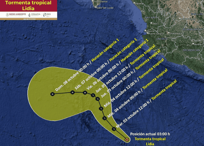 La tormenta tropical "Lidia" se formó este martes 3 de octubre en el Océano Pacífico y será huracán, según el pronóstico del Servicio Meteorológico Nacional (SMN), fuente climática oficial del Gobierno de México, que también señaló que se ubicará frente a las costas de Jalisco, lo que traerá lluvias para la Entidad.Para este día se pronostican lluvias muy fuertes (de 50 a 75 milímetros [mm]) Chiapas, Colima, Guerrero, Jalisco, Michoacán, Nayarit, Oaxaca y Veracruz; fuertes (de 25 a 50 mm) en Ciudad de México Coahuila, Durango, Estado de México, Guanajuato, Morelos, Puebla y Sinaloa; intervalos de chubascos (de 5 a 25 mm) en Aguascalientes, Campeche, Chihuahua, Hidalgo, Nuevo León, Querétaro, Quintana Roo, San Luis Potosí, Tabasco, Tamaulipas, Tlaxcala, Yucatán y Zacatecas, y lluvias aisladas (de 0.1 a 5 mm) en Baja California Sur.Las precipitaciones mencionadas serán generadas por la tormenta tropical "Lidia", originada al suroeste de las costas de Colima y Jalisco; la presencia del sistema frontal número 4, que se extenderá sobre la frontera norte de México, en interacción con una línea seca sobre Coahuila; canales de baja presión extendidos a lo largo de la Sierra Madre Occidental y el sureste del país, en combinación con ingreso de humedad del Océano Pacífico, Golfo de México y Mar Caribe, y por inestabilidad en niveles altos de la atmósfera.Se espera que las lluvias de fuertes a muy fuertes estén acompañadas de descargas eléctricas, rachas fuertes de viento y posible caída de granizo; podrían ocasionar encharcamientos, además del incremento en los niveles de ríos y arroyos, así como deslaves e inundaciones en zonas bajas, por lo que se recomienda a la población de los estados afectados atender las indicaciones de Protección Civil.A las 03:00 horas, tiempo del Centro de México, se formó la tormenta tropical "Lidia" al sur de las costas de Colima y Michoacán; se localizó a 815 kilómetros (km) al sur-suroeste de Punta San Telmo, Michoacán y a 850 km al sur-suroeste de Manzanillo, Colima. Presenta vientos sostenidos de 65 kilómetros por hora (km/h), con rachas de 85 km/h y se desplaza hacia el oeste-noroeste a 15 km/h.Para Jalisco, el día de hoy se prevén tormentas dispersas al final de la tarde en gran parte del estado, con excepción de las regiones norte y altos.Con información del Servicio Meteorológico Nacional e Instituto de Astronomía y MeteorologíaOA