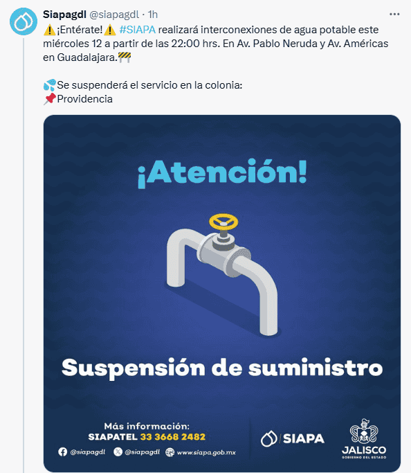 Este lunes, el Sistema Intermunicipal de los Servicios de Agua Potable y Alcantarillado (SIAPA) reportó que habrá corte de agua en una colonia del municipio de Guadalajara. Fue a través de sus redes sociales, donde el SIAPA informó que realizará interconexiones de agua potable este miércoles 12 a partir de las 22:00 horas en Av. Pablo Neruda y Av. Américas en Guadalajara.Por tal motivo no habrá servicio en la colonia Provincia y se espera que se restablezca durante la tarde del jueves 13 de marzo. Para cualquier duda o aclaración, el SIAPA pone a tu disposición diversos canales de comunicación para resolver tus inquietudes.MF
