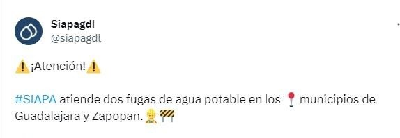 El Sistema Intermunicipal de los Servicios de Agua potable y Alcantarillado (Siapa) reportó este viernes que habrá corte de agua en algunas colonias de Guadalajara y Zapopan. A través de las redes sociales, Siapa reportó se encuentra en reparación dos fugas de agua potable en diferente puntos de los municipios ya mencionados, por la motivo se suspenderá el servicio en las siguientes colonias: Se espera que el servicio se restablezca durante la tarde del sábado 23 de septiembre. Para cualquier duda o aclaración, el Siapa pone a disposición los siguientes medios para que resuelvas tus preguntas.MF