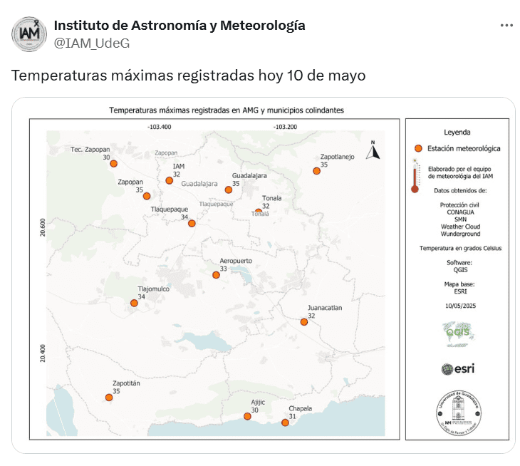 Este año, el 10 de mayo, las temperaturas máximas alcanzaron los 35 grados en Guadalajara y Zapopan, 34 en Tlajomulco y Tlaquepaque, y 32 en Tonalá.
