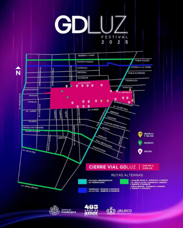 El festival GDLUZ 2025, uno de los eventos más esperados en Guadalajara, comienza este miércoles 12 de febrero para conmemorar el 483 aniversario de la ciudad con espectáculos de música, luces y arte digital.Debido a la gran afluencia de asistentes y la instalación de estructuras para el evento que se esperan desde hoy y hasta el 16 de febrero, se implementarán cierres viales temporales en diversas calles que comprenden el Centro Histórico de Guadalajara. A continuación, te compartimos la información clave para que tomes previsiones y evites contratiempos.De acuerdo con información proporcionada por el Gobierno de Guadalajara y por los mismos organizadores del festival se dio a conocer que con motivo de garantizar la seguridad de los asistentes y el correcto desarrollo del evento habrá algunas restricciones en la circulación vehicular en diversas calles principales del Centro Histórico.Las restricciones viales por GDLUZ cubrirán una zona amplia que incluirá calles como González Ortega, Avenida Juárez, Juan Manuel y Calzada Independencia.Otro sector afectado será el área del Museo Cabañas, abarcando Avenida República y Dionisio Rodríguez.Estos cierres estarán diariamente durante el festival desde las 17:00 hasta las 00:00 horas.Asimismo le recuerdan a los asistentes que el ingreso al festival puede ser desde el Hospicio Cabañas pasando por Plaza de la Liberación y la Rotonda de los Jaliscienses Ilustres y hacia la Catedral de Guadalajara o viceversa, y con el objetivo de que citadinos y turistas puedan vivir una mejor experiencia brindan las siguientes recomendaciones:El evento contará con vigilancia en los accesos, módulos de atención médica y personal capacitado para responder ante cualquier emergencia. YC