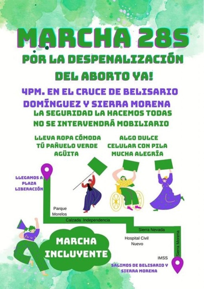 Cada 28 de septiembre colectivas feministas y mujeres de la sociedad en general se reúnen internacionalmente para visibilizar el Día de la acción global por el acceso seguro al aborto, que fue instaurado en 1990 por la Asamblea del Movimiento Feminista Latinoamericano.Ante ello se tiene previsto que en Guadalajara se desarrollen dos manifestaciones por dos rutas distintas de la ciudad. La primera de ellas es la convocada por la Red por los Derechos Sexuales y Reproductivos en Jalisco (Ddser), la cual partirá a las 16:00 horas del cruce de Belisario Domínguez y Sierra Morena, del Centro Médico Nacional de Occidente.Se trata de una manifestación incluyente que caminará sobre Sierra Morena hasta llegar a Sierra Nevada, y bajar por esta calle hasta la Calzada Independencia. De ahí las colectivas subirán hasta Plaza Liberación. Se invita a las asistentes a llevar ropa cómoda, agua, pancartas, un pañuelo verde y celular con pila.La segunda protesta, la cual está dirigida solo a mujeres de nacimiento quienes coincidan con los ideales abolicionistas y anarquistas, partirá también a las 16:00 horas, pero desde la Plaza de la República, ubicada en el cruce de la avenida México y Chapultepec, para continuar por Chapultepec hasta la Avenida Vallarta, para llegar posteriormente al Parque Juárez, conocido como “Parque Rojo”.Por ello se invita a la ciudadanía y personas automovilistas a considerar cierres viales por los pasos de estas protestas, y alternar rutas para llegar a tiempo a sus destinos sin inconvenientes mayores.FS