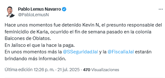 En sus redes sociales, el gobernador de Jalisco, Pablo Lemus, informó que fue detenido Kevin "N", el presunto responsable del asesinato de Karla Bañuelos, ocurrido en la colonia Balcones de Oblatos. Lemus dijo que en unos momentos, la Fiscalía de Jalisco, así como la Secretaría de Seguridad del Estado, brindarán más información.El feminicidio de Karla Bañuelos, una joven de 28 años, ocurrió la madrugada del 12 de julio, a las 02:29 horas. En redes sociales comenzó a circular un video que muestra los momentos previos al ataque, donde se observa a Karla confrontando al hombre y golpeando su auto con una escoba, en lo que parecía una discusión intensa.Segundos después, el agresor identificado como Kevin "N" le dispara en varias ocasiones con un arma larga, un rifle tipo AR-15, y luego huye del lugar a bordo de una camioneta blanca. Toda la escena quedó registrada en la grabación, lo que ha generado indignación y conmoción, y se exige justicia.Días después del hecho, la Fiscalía de Jalisco informó que el vehículo fue encontrado durante labores de patrullaje en la colonia Hacienda Santa Fe, en Tlajomulco de Zúñiga. De acuerdo con el comunicado difundido el 14 de julio, se trata de una camioneta Chevrolet Equinox, color blanco con detalles en gris, que porta placas del estado de Chihuahua.*Mantente al día con las noticias, únete a nuestro canal de WhatsAppOF